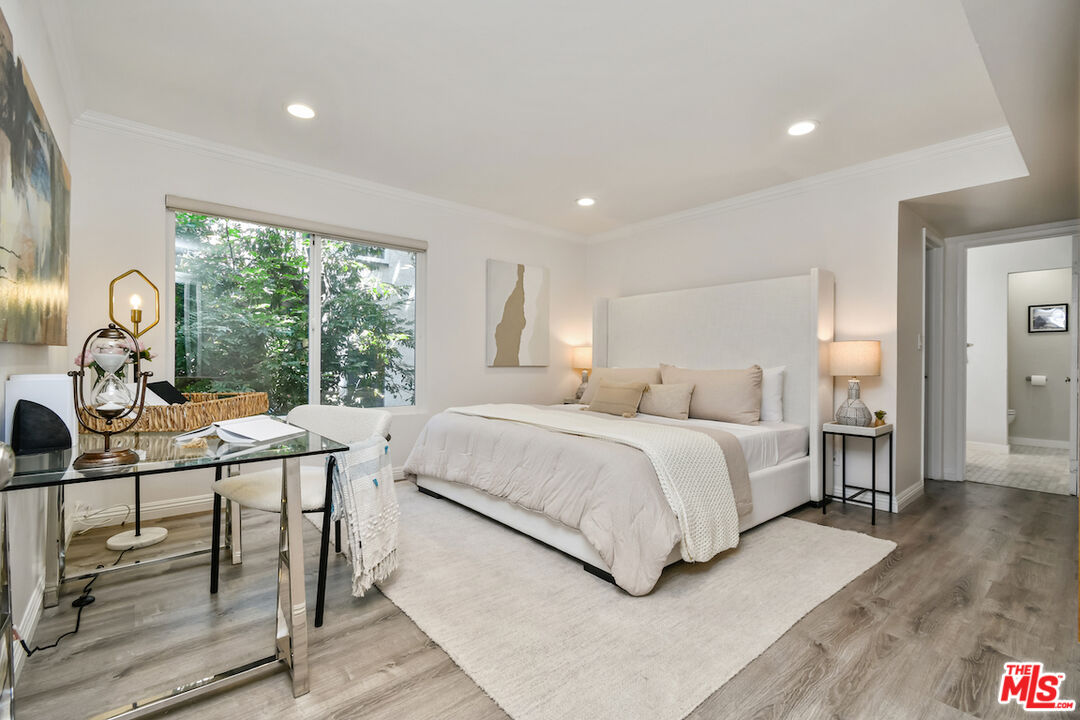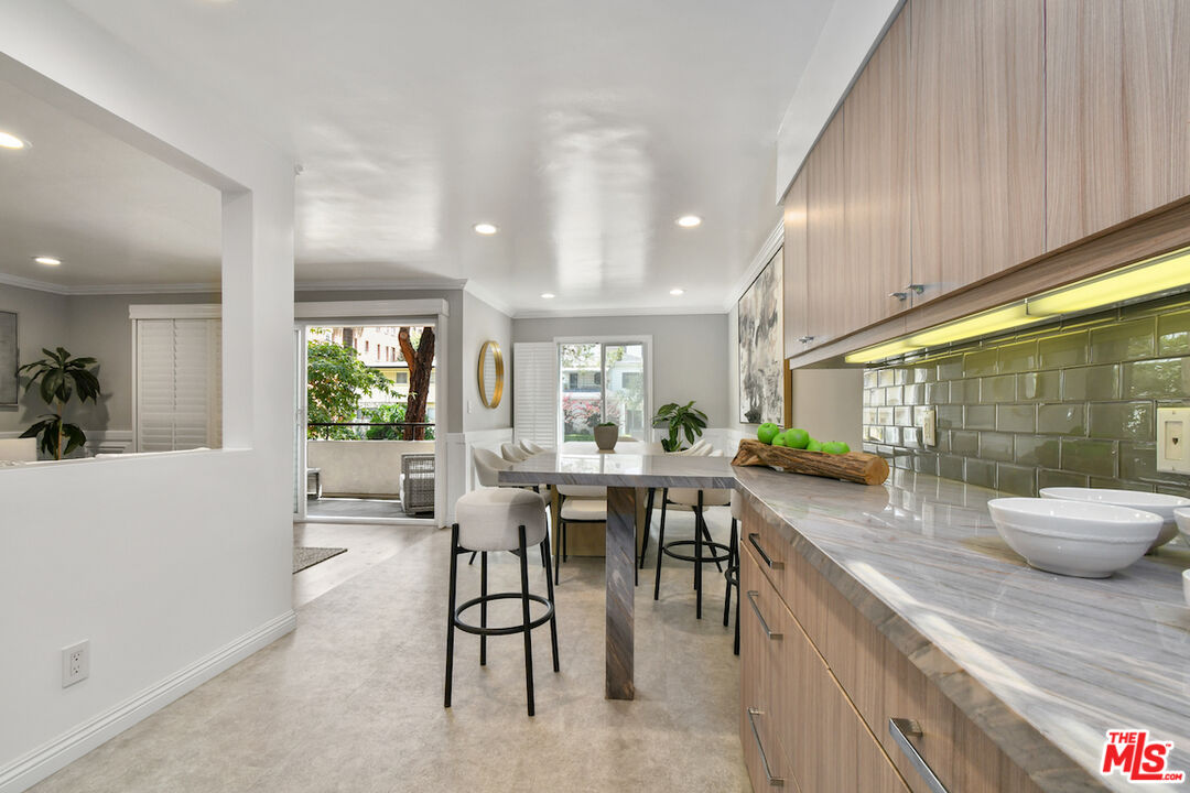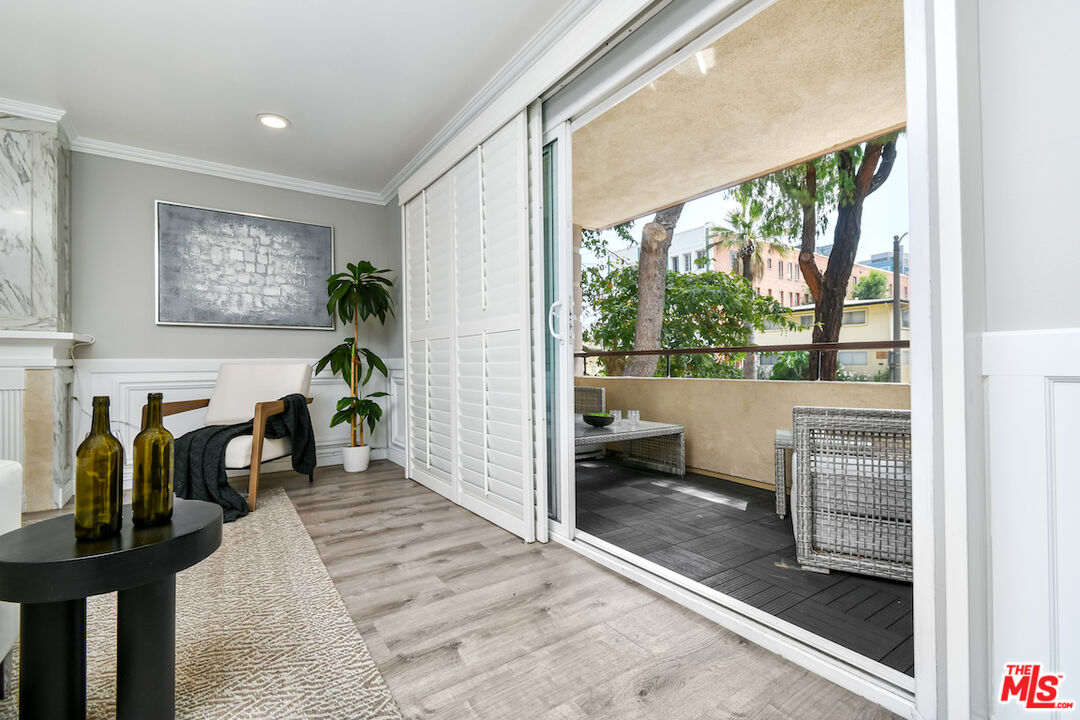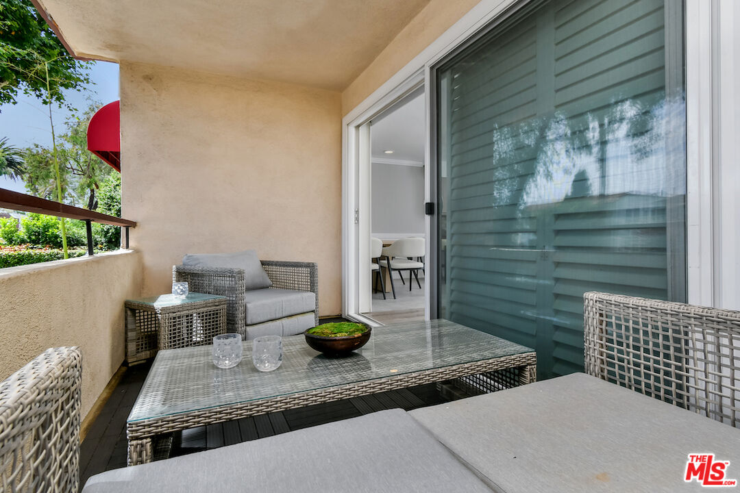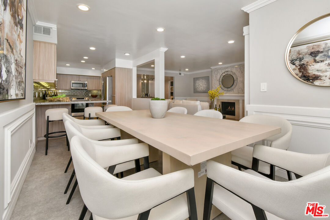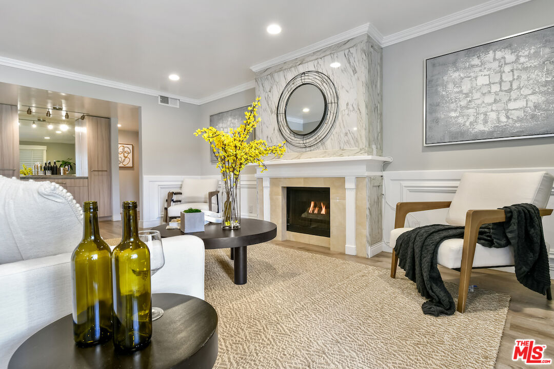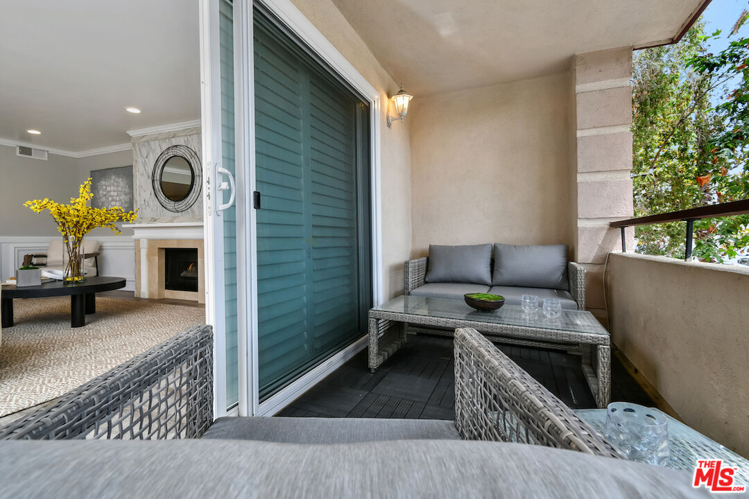 New Price! Absolutely turnkey and beautifully renovated, this single-level, front corner condo is the one you've been waiting for. With a smart, open-concept layout connecting the living room, dining area, and kitchen, it's an entertainer's dream. The inviting living room is anchored by a stylish fireplace, dry bar, and access to a private, east-facing patio; the perfect spot for morning coffee or quiet evenings. Enjoy peaceful views from every window. The cook's kitchen provides stainless steel appliances, abundant warm tone cabinetry and extensive countertops allowing your culinary adventures come to life. Opposite the kitchen, you'll find two spacious bedrooms and two full bathrooms. The primary suite features a walk-in closet and a newly updated bathroom with dual sinks and separate tub and shower. Both bedrooms offer large windows overlooking sun-dappled greenery bringing in gorgeous, filtered light throughout the day. Additional highlights include an in-unit laundry room, no shared walls, abundant storage, parking for two cars in a secure, gated garage and a controlled-access lobby. HOA earthquake insurance for 2025 has been prepaid by Seller. Located within the highly rated Beverly Hills School District and just moments from premier dining, shopping, La Cienega Park, Beverly Hills Tennis & Pickleball, Restaurant Row, LACMA, The Academy Museum and David Geffen Theater. A truly special home in an unbeatable location.