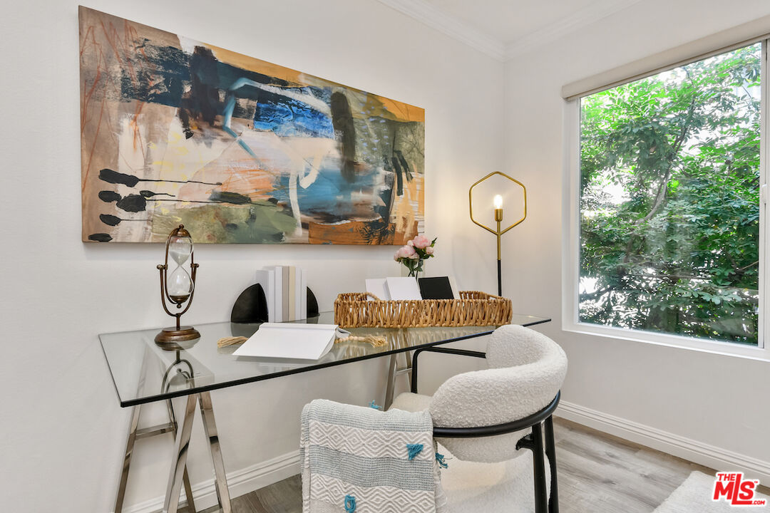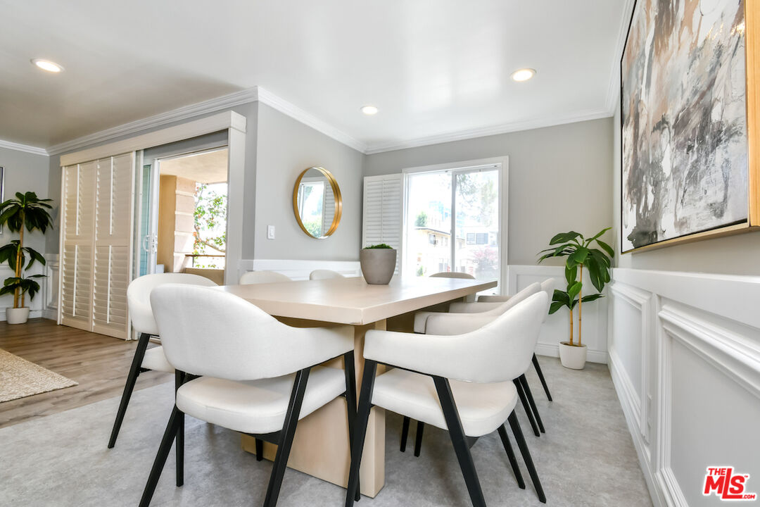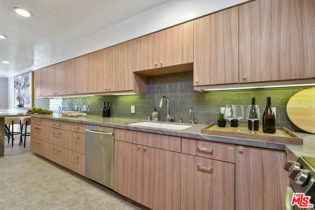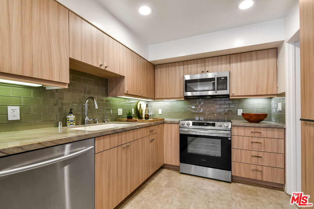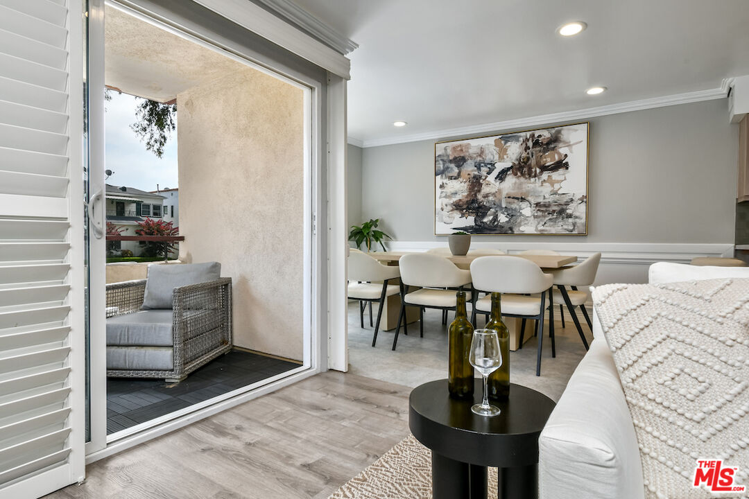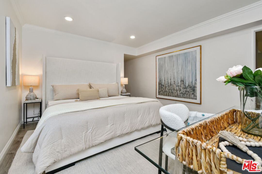 New Price! Absolutely turnkey and beautifully renovated, this single-level, front corner condo is the one you've been waiting for. With a smart, open-concept layout connecting the living room, dining area, and kitchen, it's an entertainer's dream. The inviting living room is anchored by a stylish fireplace, dry bar, and access to a private, east-facing patio; the perfect spot for morning coffee or quiet evenings. Enjoy peaceful views from every window. The cook's kitchen provides stainless steel appliances, abundant warm tone cabinetry and extensive countertops allowing your culinary adventures come to life. Opposite the kitchen, you'll find two spacious bedrooms and two full bathrooms. The primary suite features a walk-in closet and a newly updated bathroom with dual sinks and separate tub and shower. Both bedrooms offer large windows overlooking sun-dappled greenery bringing in gorgeous, filtered light throughout the day. Additional highlights include an in-unit laundry room, no shared walls, abundant storage, parking for two cars in a secure, gated garage and a controlled-access lobby. HOA earthquake insurance for 2025 has been prepaid by Seller. Located within the highly rated Beverly Hills School District and just moments from premier dining, shopping, La Cienega Park, Beverly Hills Tennis & Pickleball, Restaurant Row, LACMA, The Academy Museum and David Geffen Theater. A truly special home in an unbeatable location.