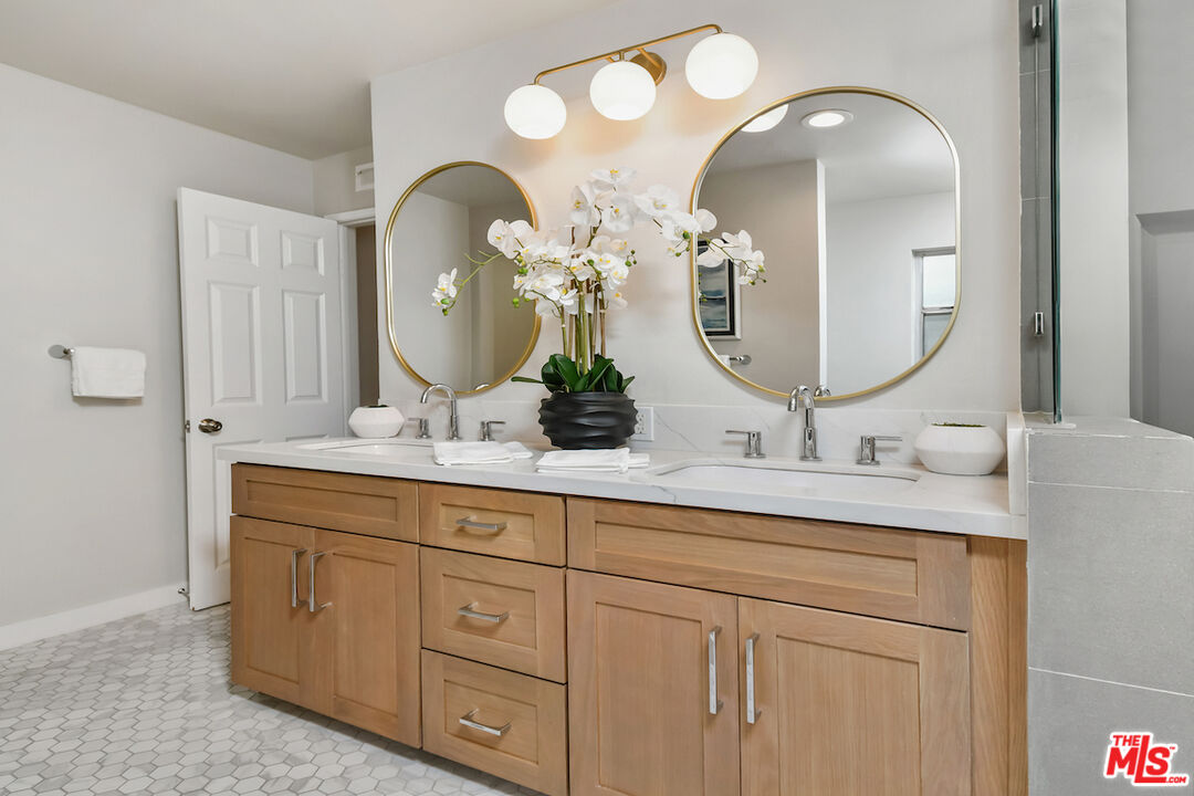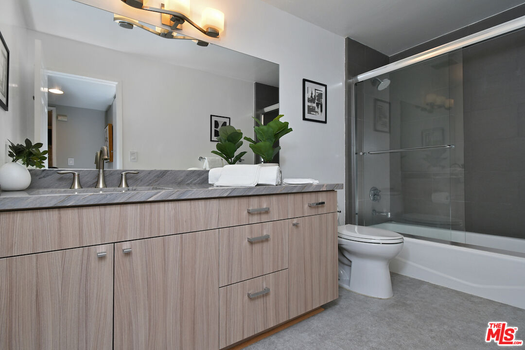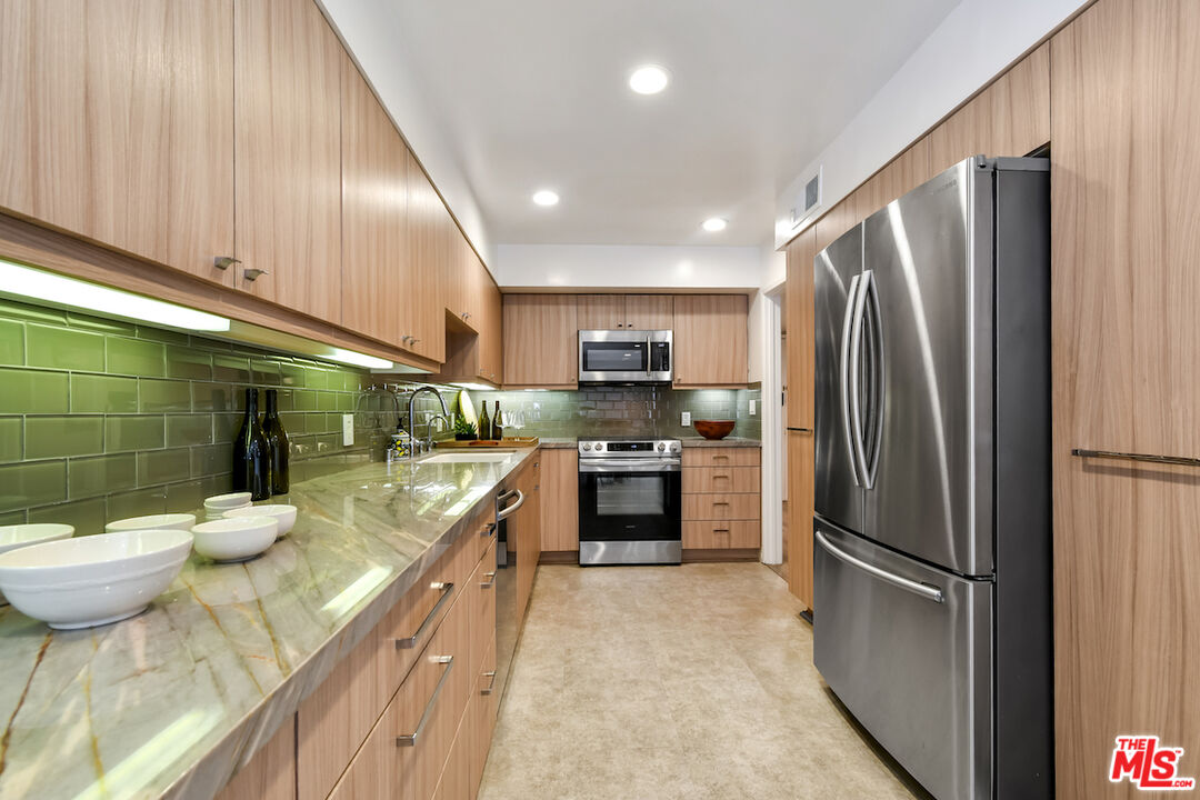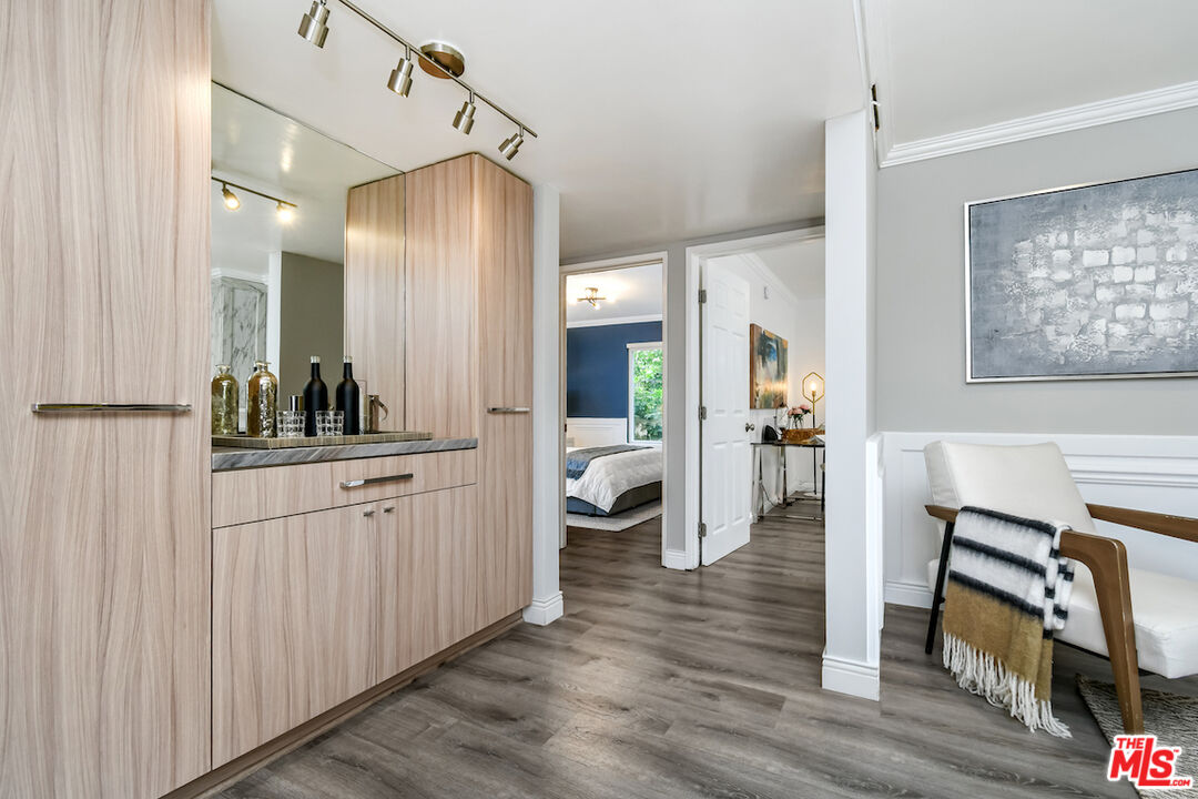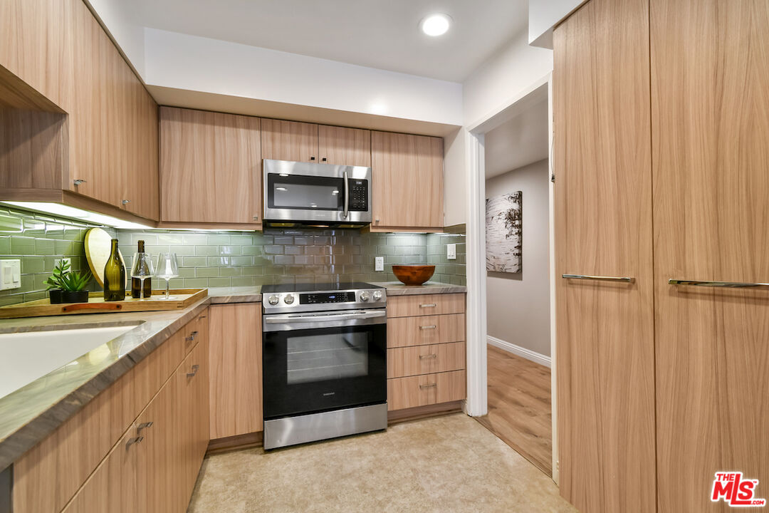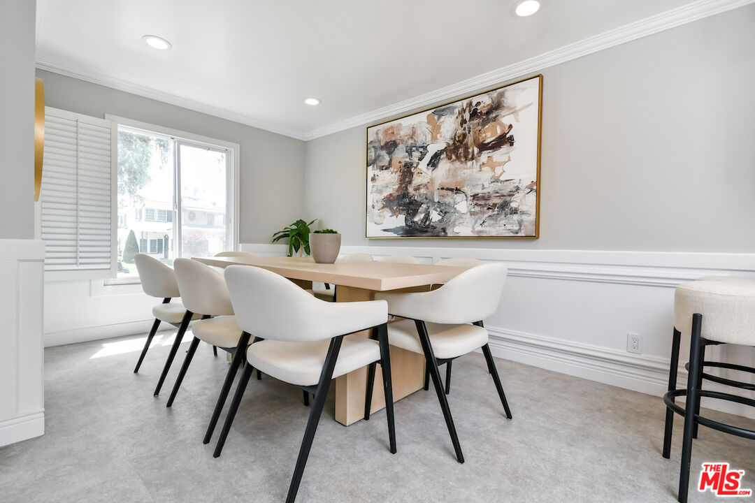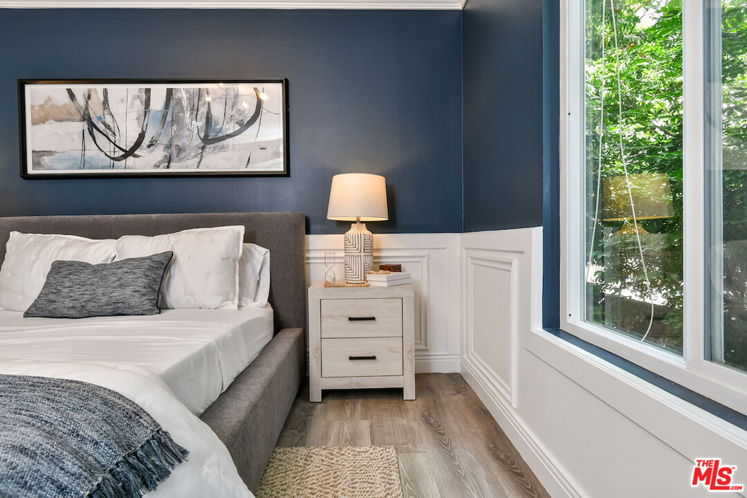 New Price! Absolutely turnkey and beautifully renovated, this single-level, front corner condo is the one you've been waiting for. With a smart, open-concept layout connecting the living room, dining area, and kitchen, it's an entertainer's dream. The inviting living room is anchored by a stylish fireplace, dry bar, and access to a private, east-facing patio; the perfect spot for morning coffee or quiet evenings. Enjoy peaceful views from every window. The cook's kitchen provides stainless steel appliances, abundant warm tone cabinetry and extensive countertops allowing your culinary adventures come to life. Opposite the kitchen, you'll find two spacious bedrooms and two full bathrooms. The primary suite features a walk-in closet and a newly updated bathroom with dual sinks and separate tub and shower. Both bedrooms offer large windows overlooking sun-dappled greenery bringing in gorgeous, filtered light throughout the day. Additional highlights include an in-unit laundry room, no shared walls, abundant storage, parking for two cars in a secure, gated garage and a controlled-access lobby. HOA earthquake insurance for 2025 has been prepaid by Seller. Located within the highly rated Beverly Hills School District and just moments from premier dining, shopping, La Cienega Park, Beverly Hills Tennis & Pickleball, Restaurant Row, LACMA, The Academy Museum and David Geffen Theater. A truly special home in an unbeatable location.