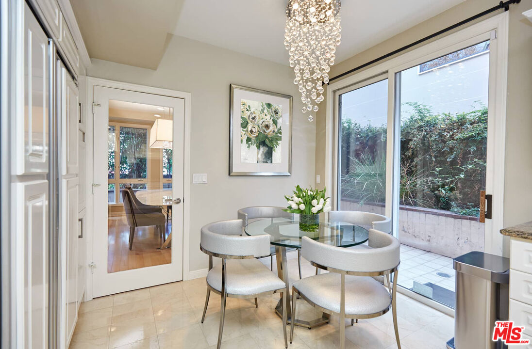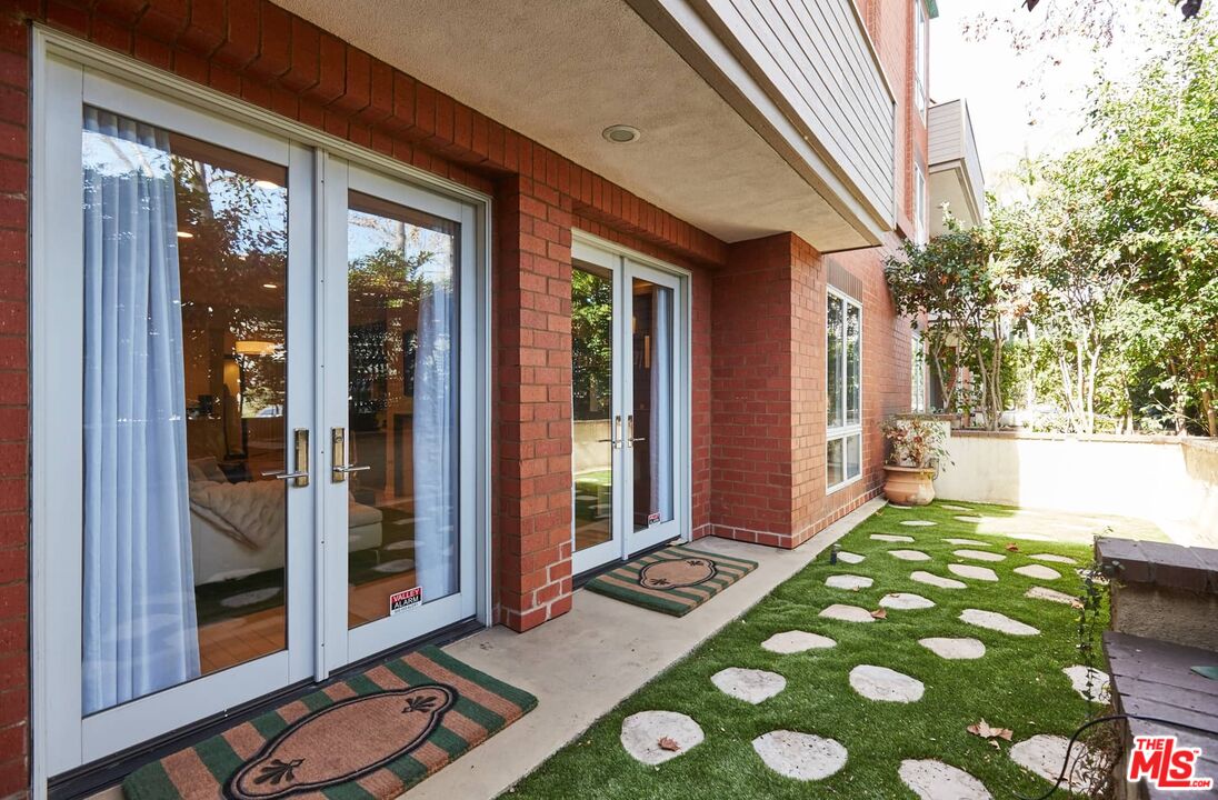 Serene single-level luxury condo in Prime Beverly Hills with a RARELY-FOUND apprx 525 sqft 2-sided garden patios!  Ideal for pet owners and those wanting a pretty yard for backyard space. Discover indoor-outdoor living at its best in this pristine 1719 sqft unit at the prestigious Almont Plaza. Ideally situated on a quiet, tree-lined street just north of Wilshire, this beautifully updated 2-bedroom, 2.5-bath condo feels like a private home complete with lush wraparound garden patios that create a tranquil retreat in the heart of the city. Located in a secure building, this rare first-floor corner unit offers complete privacy and a seamless flow for relaxed living and elegant entertaining. The expansive layout features a formal double-door entry, gracious foyer, and large living room with fireplace, custom built-ins, bar and walls of glass that bring the gardens in. The oversized formal dining room sets the stage for memorable gatherings. A bright, airy kitchen opens to the patio and is outfitted with top-tier appliances including a Sub-Zero fridge, white cabinetry, a spacious breakfast area, and side-by-side laundry. Designer finishes, wide-plank wood floors, and oversized windows add sophistication throughout. The generous primary suite boasts a remodeled spa-like bath and an oversized walk-in closet. The second bedroom is equally spacious with a private ensuite bath, plus there's a beautiful powder room for guests. Additional highlights include a full security system, 2-car side-by-side parking in a gated secured garage, and access to luxurious building amenities: a stylish lobby, gym, sundeck, and meeting room. Water and EQ insurance included in HOA dues. Walk to restaurants and enjoy the best of the Beverly Hills lifestyle, renowned shopping, entertainment, Beverly Hills school district, police and fire.  Furnishings shown in photos are excluded and have been removed. Easy to show - This rare garden gem won't last!