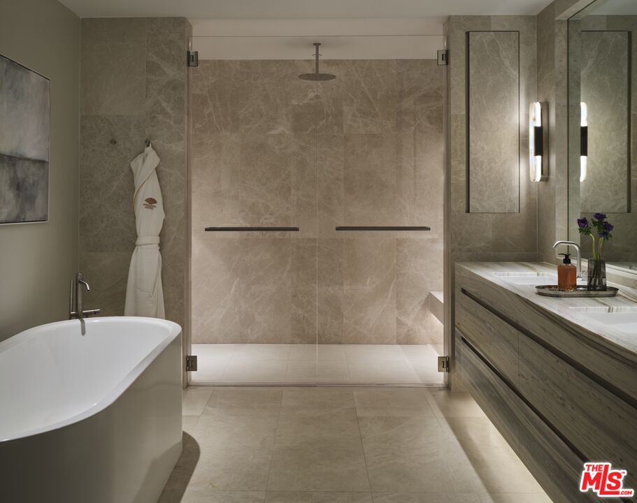 A harmonious blend of privacy and indulgence, Mandarin Oriental Residences, Beverly Hills offers the intimacy of a private home enhanced by the legendary service of a five-star hotel. Designed in collaboration with internationally acclaimed 1508 London, each residence is a master class in refinement, where daily rituals are elevated into moments of quiet luxury. The rooftop is a sanctuary unto itself, with sweeping views of Beverly Hills' iconic palm-lined streets. Surrounded by citrus trees and fragrant plantings of lavender, rosemary and sage the rooftop oasis features a heated pool, towel service, and serene lounge areas infused with calming natural scents. Wellness offerings continue with an impeccable spa suite featuring private treatment rooms, a steam room and sauna, and a state-of-the-art fitness center with Technogym equipment, private ballet/yoga room, and a sunlit outdoor terrace overlooking Century City and the pool. On the ground level, residents enjoy access to a private boardroom and cozy fireplace lounge, perfect for entertaining or working from home in style. Around-the-clock valet, concierge, and residence services ensure every detail is handled with signature Mandarin Oriental grace and discretion. Featuring a gracious two-bedroom layout with tranquil northeast exposures and a formal entry leading into a loft-like Great Room that flows effortlessly to a private treetop terrace. The open chef's kitchen is anchored by a leathered Taj Mahal quartzite peninsula, perfect for casual dining or entertaining. The en-suite guest bedroom overlooks the lushly landscaped Palm Court, while the serene primary suite offers a generous walk-in closet and five-fixture bath designed for total relaxation.