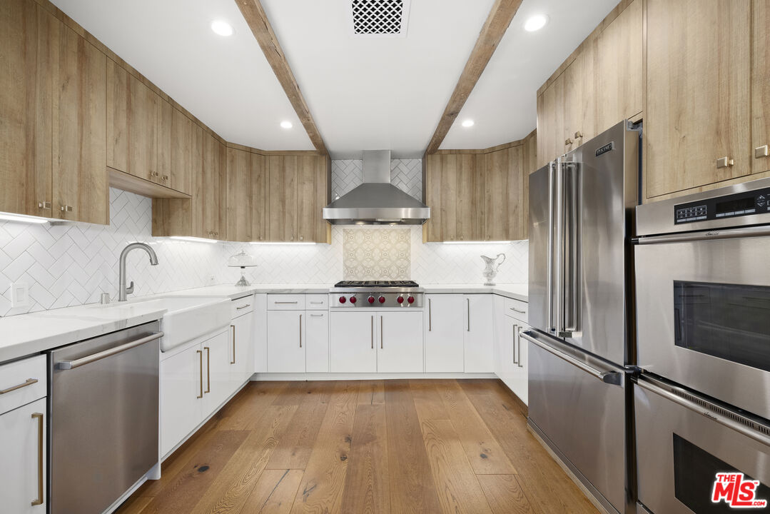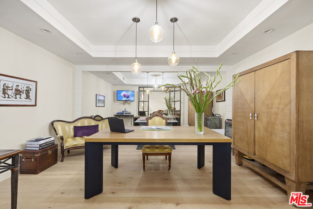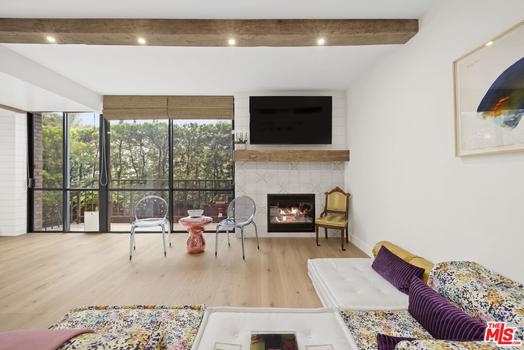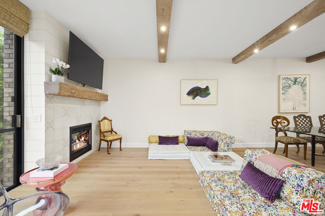 Rare offering in the heart of Beverly Hills full-service living with VALET parking and exceptional amenities. Enter through a formal foyer featuring a dramatic circular staircase leading to a beautifully remodeled residence, designed with meticulous attention to detail and sophisticated high-end finishes. This spacious two-bedroom plus separate den, two-and-a-half-bathroom condominium offers elegant living with new hardwood floors throughout. The expansive living area opens to a large private patio, perfect for entertaining or relaxing in a tranquil outdoor setting. The chef's kitchen features premium appliances, abundant storage, and a bright breakfast area. Upstairs you are welcomed by a coffee bar to your primary bedroom with walk in closet, vanity area and spa like bathroom. Second bedroom with newly remodeled en suite bath. Residents enjoy 24-hour doorman and valet service, a resort-style pool, and a state-of-the-art fitness center. The building has recently completed a comprehensive plumbing replacement, ensuring peace of mind for years to come. Experience comfort, style, and convenience all within moments of world-class dining, shopping, and entertainment in Beverly Hills.