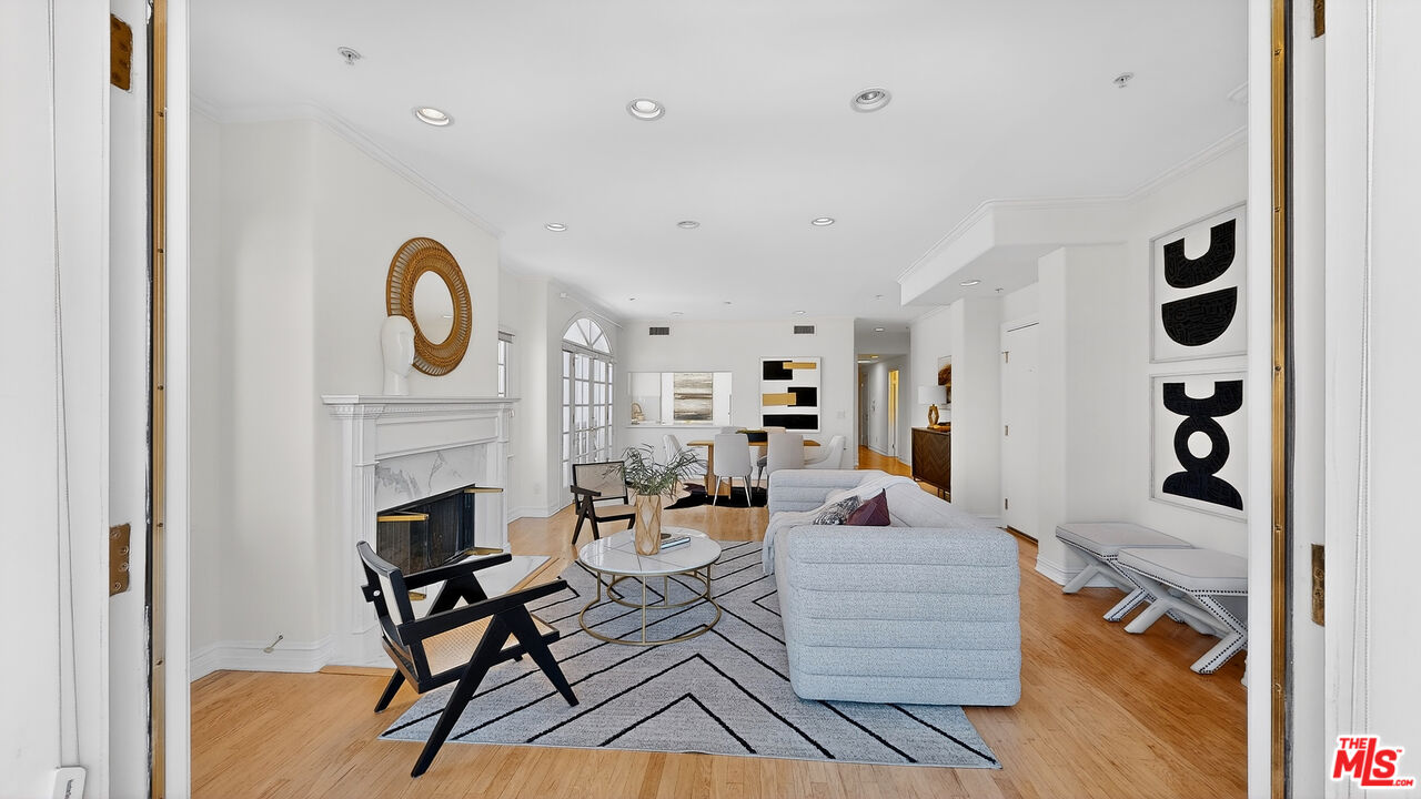 Perched atop a quiet, tree-lined street in prime Beverlywood, just moments from Beverly Hills, this top-floor penthouse has been newly renovated with a sophisticated design. The 2-bedroom, 2.5-bath residence blends timeless elegance with modern luxury. Bathed in natural light, the interiors are framed by oversized windows that create a luminous, gallery-like ambiance throughout. The formal living room is both dramatic and inviting, anchored by a statement fireplace and highlighted by arched French doors that open to a private balcony. From here, sweeping mountain vistas and shimmering Beverly Hills city lights provide a breathtaking backdrop for sunset evenings. The kitchen has been impeccably renovated with top-tier, brand-new appliances and curated finishes. A deep-basin farmhouse sink, bespoke cabinetry, and an intimate breakfast nook evoke effortless European charm while delivering modern functionality. The primary suite is a serene retreat, offering a generous walk-in closet plus an additional reach-in closet. The spa-caliber primary bath features a double vanity, freestanding soaking tub, and a separate glass-enclosed shower, creating a true sanctuary experience. The secondary bedroom is also en suite, and a chic powder room serves guests with understated elegance. A spacious in-unit laundry room, two secured parking spaces, and private storage complete the offering. Ideally located adjacent to Beverly Hills, Century City, and Hillcrest Country Club, and moments from world-class shopping, dining, parks, and places of worship, this penthouse represents a rare opportunity to own a turnkey, light-filled retreat in one of the Westside's most sought-after neighborhoods. Please note that certain images have been virtually staged for illustrative purpose.