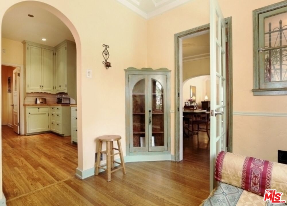 Lower unit in gorgeous Spanish duplex in historic Carthay Square HPOZ. Old world charm and new world convenience abound in this sunny unit. Large step-down living room with decorative fireplace, separate dining room with original deco ceiling. Separate breakfast room adjacent to the kitchen and formal dining room with original built-ins. Updated kitchen with stainless appliances, refrigerator w/ ice maker, d/w, range, disposal, separate laundry and pantry. Intricate art deco moldings, high ceilings, hardwood floors, sunlit windows, original architectural details, 2 ample bedrooms, large art deco tiled bath with tub and step-in shower, central heat and a/c complete this gem. Beautiful front and rear yards, with mature landscaping - fruit trees, rosemary, jasmine and roses is shared with the upstairs tenant. Private one car garage with additional storage. Quiet street with permitted resident parking. Convenient to everything -- just minutes to trendy shops and restaurants, Beverly Hills, Century City, The Grove, Farmers Market, Museum Mile, and Pico Robertson. Most pets welcome! Tenant pays utilities and renter's insurance. Some photos may be of the upper unit with the identical floorplan, or of the prior tenant's furnishings. Available now.