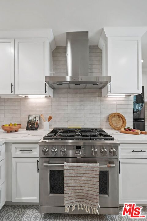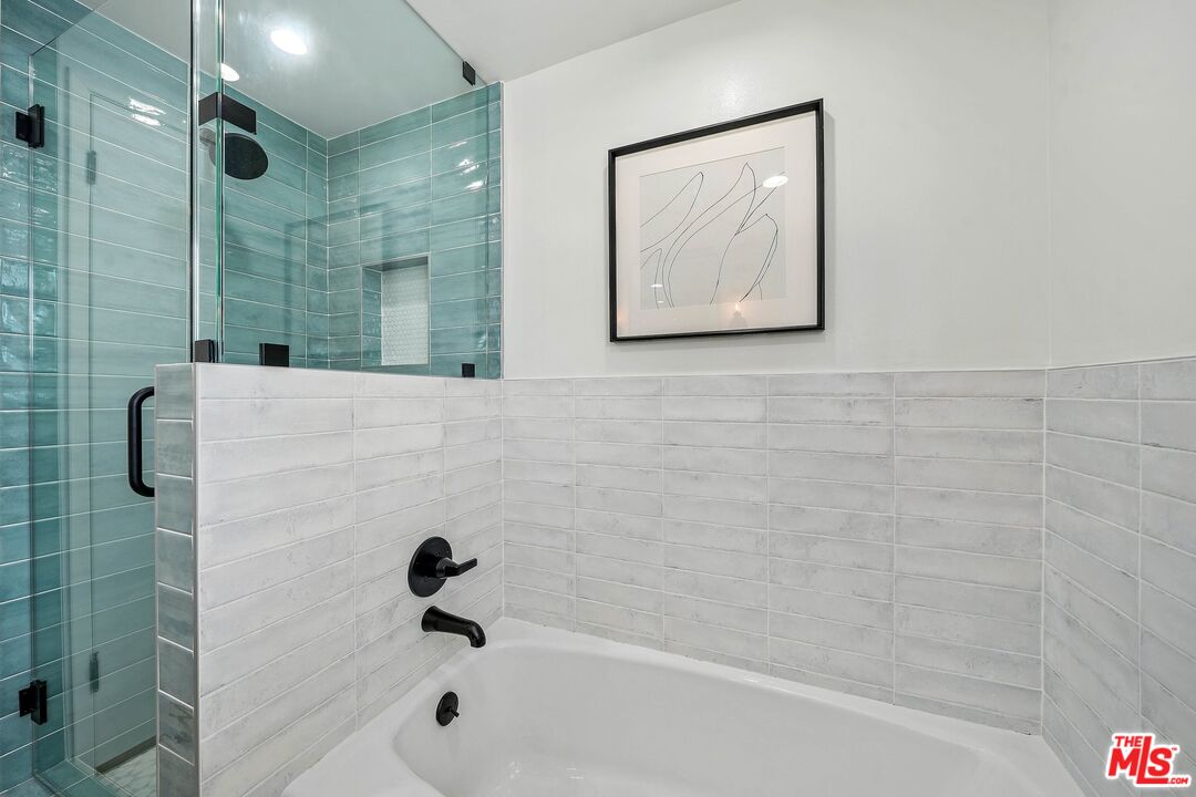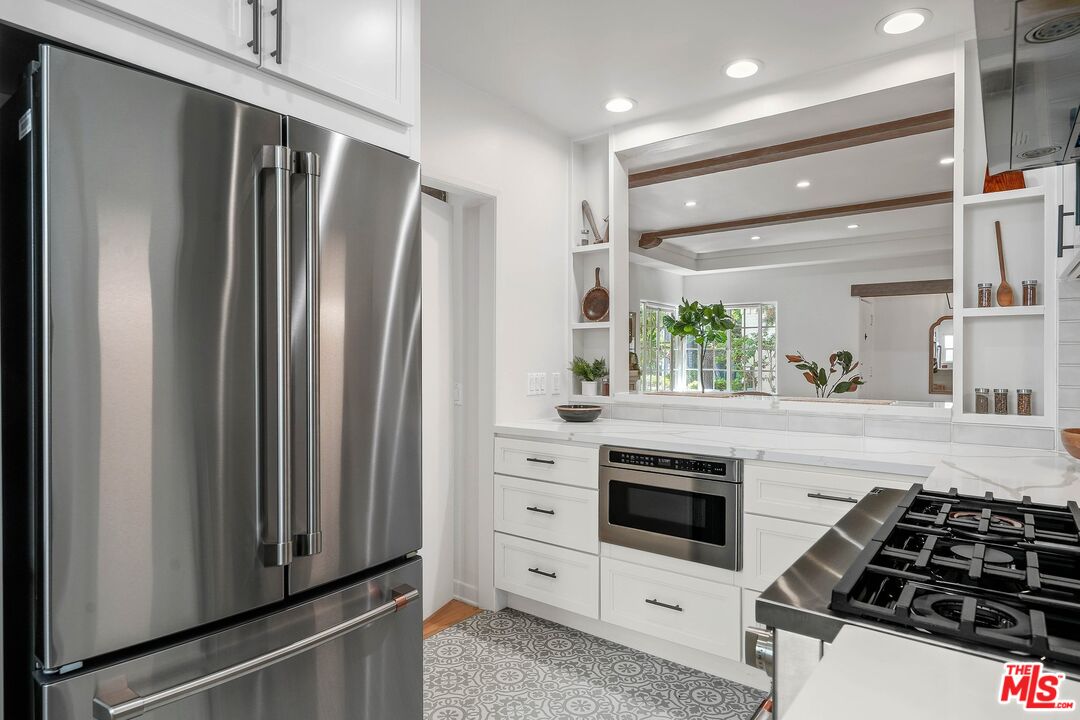 Discover the allure of classic 1930s Old Hollywood charm seamlessly blended with modern conveniences in this rare two-story townhome located in the heart of Beverly Hills. With two bedrooms and one and a half bathrooms, this meticulously renovated residence offers just under 1,400 sq ft of elegant living space. The main floor welcomes you with a living room featuring newly renovated hardwood floors, a cozy fireplace with a classic mantle, and abundant natural light, highlighted by exposed wood beam ceilings. The elegant dining room showcases a beautifully crafted ceiling with rich wood planks, creating a warm, inviting atmosphere that perfectly complements the sophisticated decor. The modern kitchen is a chef's dream, featuring brand new stainless steel Caf appliances, including a French-door refrigerator with an internal water dispenser and a freezer drawer, a built-in microwave drawer oven, a stainless steel dishwasher, and a smart gas commercial-style range with six burners. The kitchen also offers a breakfast bar and a separate laundry area with a frontload LG washer and dryer. A convenient powder room is available for guests downstairs. Upstairs, you'll find two spacious bedrooms and a beautifully appointed bathroom. The primary bedroom features French doors leading to a private deck, perfect for relaxing or entertaining. The bathroom is elegantly designed with exquisite tile floors, quartz countertops, and a separate tub and shower. Additional features include recessed lighting, central air and heat with Google Nest smart thermostats on each floor, and one private garage with remote control access. Ample storage areas and linen closets are thoughtfully placed throughout the home. Enjoy the shared private brick patio for dining al fresco. Located just moments away from iconic landmarks such as Rodeo Drive, Beverly Gardens Park, Saks Fifth Avenue, and the historic Beverly Hills Hotel, this townhome offers a rare opportunity to live in one of the most coveted areas of Beverly Hills. Experience the perfect blend of historic charm and modern luxury in this exceptional residence.