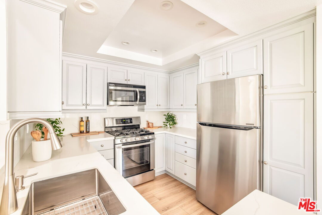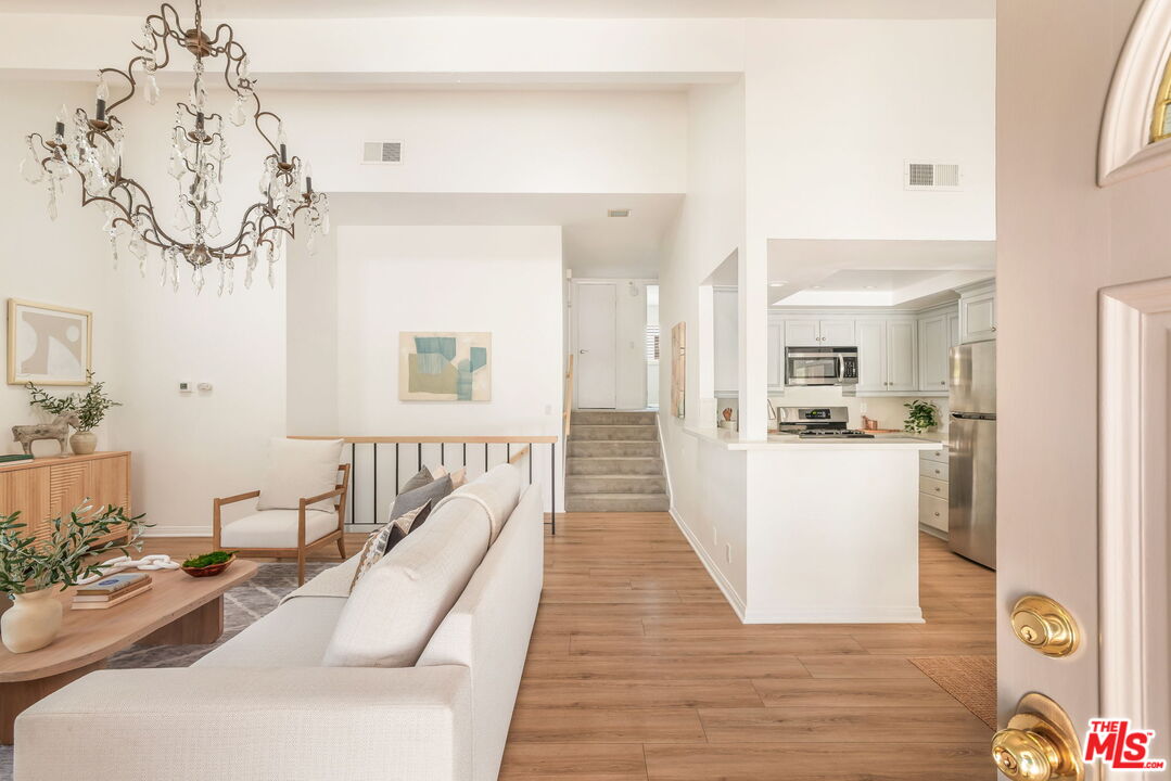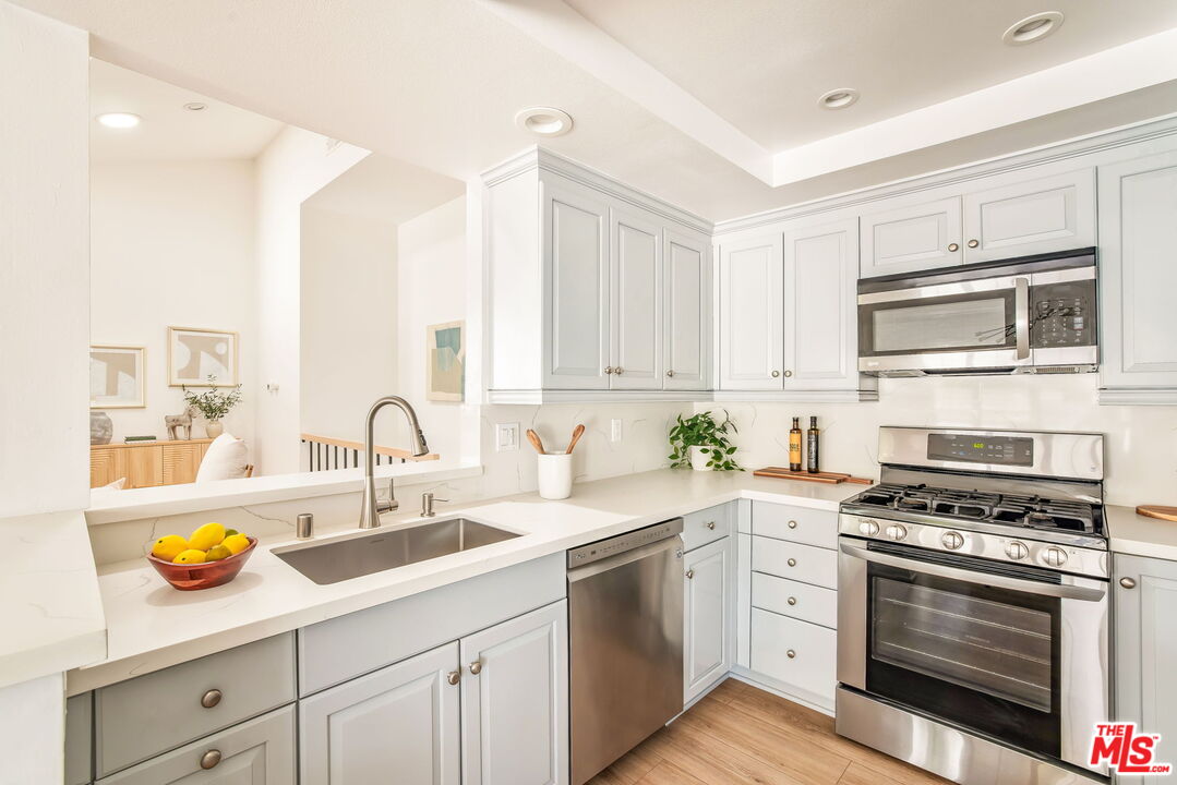 Welcome to your own slice of paradise in the peaceful Palisades Highlands. This fully updated, light-filled corner townhome offers 2 bedrooms, 2 bathrooms, and a versatile bonus room off the laundry area perfect for a home office or gym. The private two-car garage provides direct access to the main living level, where vaulted ceilings and a cozy fireplace anchor the open-concept living and dining area. Thoughtfully renovated throughout, the home features a brand-new kitchen with modern appliances, updated wood flooring, new tile and stone finishes. A spacious front patio invites seamless indoor/outdoor living with tranquil views of the surrounding mountains.Enjoy resort-style amenities just steps from your door, including scenic trails, a community pool, spa, and gym. Fully remediated following the Palisades fire, this home is move-in ready and better than ever.