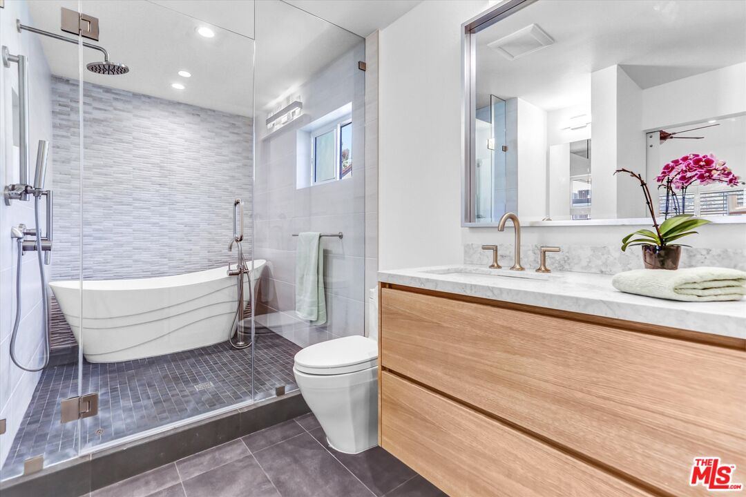 Where the Mountains Meet the Coast and Your Best Life: Imagine mornings that begin with mountain views stretching across the Palisades Highlands. This isn't just a town home, it's a carefully composed vertical sanctuary where every level reveals another reason to stay. Enter the living room under a soaring ceiling, anchored by a sleek electric fireplace, where plantation-shuttered glass doors frame your private garden patio. Already, you're home. But the architecture has other ideas: glass railings guide you upward to an elevated dining area, suspending you above the living room with a commanding perspective in a play of light. The kitchen and versatile guest room occupy the middle realm with functional luxury and views that make you linger. Then, the ascent to your private floor: a primary suite that feels like the town home's secret. Your own balcony with spectacular mountain views. A walk-in closet that actually accommodates a wardrobe. And a spa-inspired wet room where the day's concerns dissolve under rainfall showers or in a soaking tub surrounded by clouds of steam. Below ground, practicality elevated: a spacious laundry room just off the two-car garage with plenty of storage. Your New Backyard: Tennis courts. A fitness center with sauna and steam rooms. Pool and whirlpool overlooking the mountains. And beyond the gates: beach mornings in minutes, Santa Monica's energy at your doorstep, Malibu's coastline whenever the mood strikes. The truth is some homes check boxes. This one rewrites what you thought possible in Pacific Palisades where mountain quietude and coastal access aren't trade-offs, but your everyday reality. This is the life you've been designing in your head. Now it has an address. [Note: Some photos have had artwork on walls digitally added which have been notated in caption. Each digitally altered photo is followed by the original unaltered photo.]