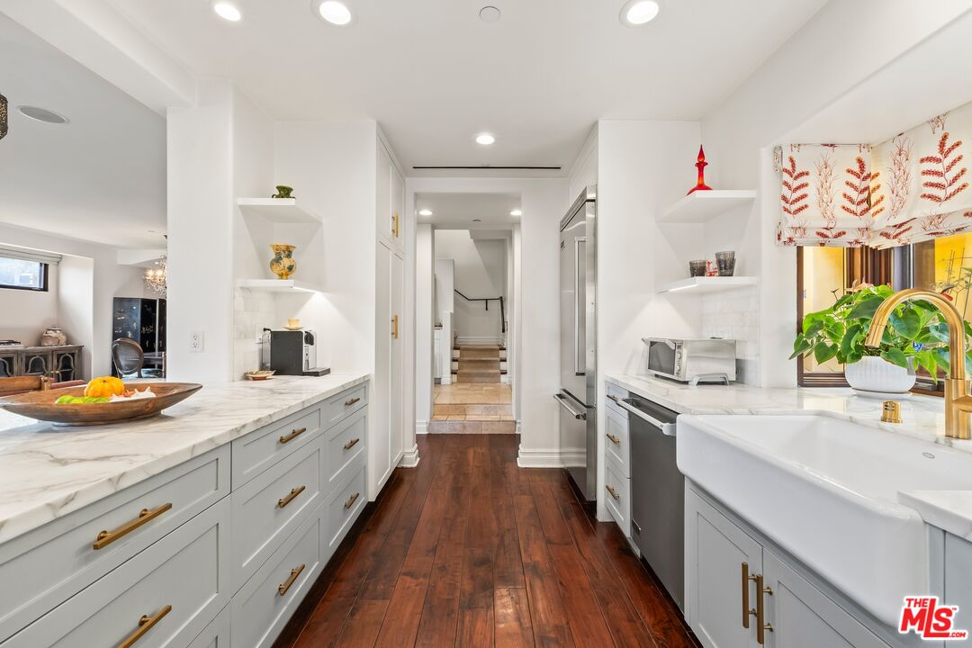 MOTIVATED SELLER. Discover this charming townhouse nestled in the heart of Santa Monica's coveted Bella Casa, an intimate community of just eight townhomes a stone's throw from Montana Avenue. This corner unit features a comfortable living and dining area that flows seamlessly through the entryway with stone imported from the South of France into a recently upgraded chef's kitchen, showcasing luxurious Calacatta gold marble slab countertops, breakfast bar, and top-of-the-line Viking appliances. The main level powder room delights with sophisticated Koi wallpaper by Osborne & Little and Walker Zanger tile. The home includes three bedrooms each with their own Juliet balconies, a spacious full bathroom with honed limestone, and a primary suite boasting a cozy fireplace with imported Moroccan tile, soaring ceilings, and a luxuriously updated bathroom retreat featuring more exquisite Moroccan tile. A versatile office/den space opens to a south-facing roof deck beneath a pergola, offering panoramic views across Santa Monica and peekaboo glimpses of the Pacific Ocean, while the standout massive oversized direct entry 4-car garage provides extraordinary potential for customization into a home gym, recording studio, creative workspace, or other personalized uses. This centrally located sanctuary offers effortless proximity to the vibrant boutiques and restaurants along Montana Avenue, quick access to Pacific Coast Highway, Brentwood, and all the premier amenities of LA's coveted Westside.
