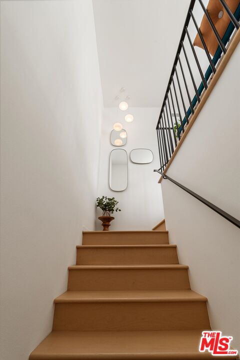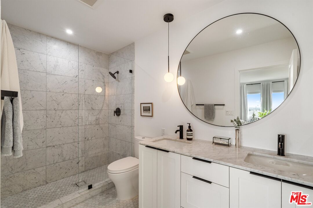 Introducing a fully permitted, designer-renovated top-floor residence in one of Santa Monica's most coveted neighborhoods. Completed between 2021 & 2022 with an owner-driven design and meticulous attention to detail, this 1,500 sq ft, 2-bedroom, 2-bath, light-filled home delivers luxury, functionality, and a rare level of quality for the Wilshire/Montana market. Located in a charming 7-unit complex, the unit features 9'+ ceilings, southwest-facing exposure, new double-pane windows, custom window coverings, and expansive sliding glass doors that bring in beautiful natural light and views of palm trees, cityscape, and even a slight ocean view on clear days. The extensive renovation includes oak wood flooring, custom-height baseboards, all new interior shaker doors with upgraded hardware, Baldwin front door hardware, a wrought-iron stair railing, Benjamin Moore Zero VOC paint, custom electrical work, new light fixtures throughout, and LED strip lighting in key areas. The home also features a new heat pump (2021), new air handler (2023), and a Halo LED air scrubber, ensuring clean indoor air and energy-efficient comfort.The chef's kitchen is a standout: custom shaker/flat-panel cabinetry (soft-close, dovetail construction), Pental honed quartz counters + waterfall peninsula, floating shelves with integrated LED lighting, and high-end appliances including Bosch, Sharp, and LG washer/dryer. A built-in bar with custom cabinetry and low-iron " Starphire glass shelving adds beauty and functionality to the main living space.Both bathrooms were completely rebuilt and feature honed Carrara marble floors, walls, and counters, high-quality plumbing fixtures, frameless glass shower, custom cabinetry, new toilets, sinks, tub, and a built-in medicine cabinet in the primary suite. The primary bedroom includes a California Closets custom walk-in closet, while upgraded hallway closets offer additional organized storage. The elegant fireplace has been rebuilt with a Statuarietto marble surround and updated to code with gas ignitionfully functional for gas logs or decorative. A rare Santa Monica amenity, the home includes 3 parking spaces: a private two-car tandem garage, one additional parking space, plus a large private storage room, all exclusive to Unit 5.Located in the highly sought-after Franklin School District, the property sits just moments from Montana Avenue's boutiques, cafs, Erewhon, Whole Foods, Trader Joe's, top dining, banking, healthcare, and the beach. Near all your needs, convenience, and a quiet residential setting make this an unbeatable location. This is truly a turnkey, top-floor designer renovation with thoughtful materials, low/zero VOC products, premium fixtures, storage, light, airflow, and an elevated layout that provides calm, luxury, and joy. Homes of this caliber in a 7-unit building rarely hit the market. See pvt remarks for a showing requests.