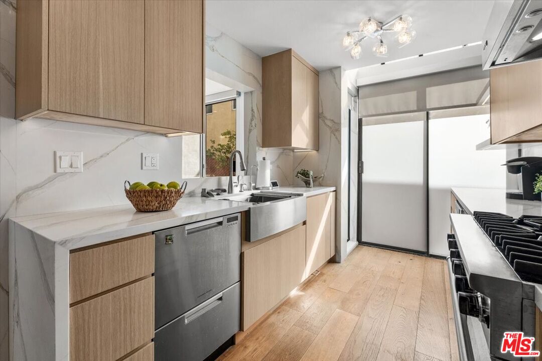 LOCATION, LOCATION, LOCATION! Prime Santa Monica Townhouse, Located just a few blocks from the Beach, just south of Montana Avenue. This sumptuous updated 3 Bedroom, 3 Bath Townhouse illuminates with Natural light coming from all direction. The Large Galley Kitchen has been updated with Strikingly Beautiful Quartz counter tops, Fisher & Paykel Dishwasher and Viking Appliances, Top of The Line Custom White Oak (Inside and Out) Cabinetry, state of the art water filtration system, BEY glass rinser, Moen smart faucet, remote under cabinet lighting and Large Stainless Steel farmhouse work station sink are beyond impressive. The inviting living room and dining area are also extremely welcoming with center fireplace, wet bar and oversized outdoor private patio for socializing, reading or dining al fresco. The Large Primary suite, with fireplace is an oasis of serenity, calm, privacy and an abundance of natural light and Large Closets! The additional bedroom en-suites are both light and bright. Private two car direct access garage with extra large storage and laundry area make this townhouse the ideal home by the beach. Perfectly situated moments away from Montana Avenue which offers a curated selection of upscale boutiques, unique shops and upscale markets providing a more relaxed coastal shopping experience.