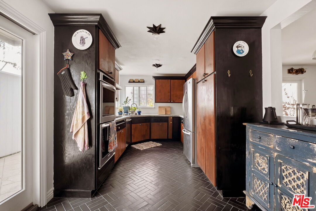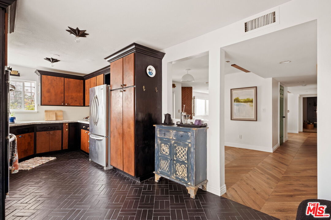 This is home. It's warm and thoughtfully designed, pulling you in. This 3 bd 2.5 ba home is all you really need. The open living room with chevron floors faces a beautiful two-sided tiled fireplace and leads out to an expansive terrace that wraps around the unit. There's room for al fresco dining, an outdoor kitchen, and an entire conversation pit. The kitchen features stainless steel appliances and stainless backsplash, hand-selected hardware, double ovens, Caesarstone countertops, and ample storage space. The primary suite includes a cozy fireplace, a generous walk-in closet, and an en-suite bathroom with a clawfoot soaking tub and separate rain shower. The two additional bedrooms have both been designed with meticulous detail, currently being used as an office and a guest bedroom. Additional amenities include Fireclay tile throughout the unit, in-unit laundry, 2 side-by-side parking spaces with a private covered garage, and a private storage unit. This truly Mid-Century home is centered in the heart of Santa Monica's most walkable neighborhood and provides easy access to both the bluffs and Montana Avenue's boutiques and cafes. This special home has been hand-designed over time with acute attention to detail, creating a space that is both highly curated and warm and inviting. This home is walks to the beach at the end of the day and mornings by the fireplace. It's where you'd want to write your novel or read someone else's. There's room for all of your beautiful things. This is where you'll want to be for a long long time.