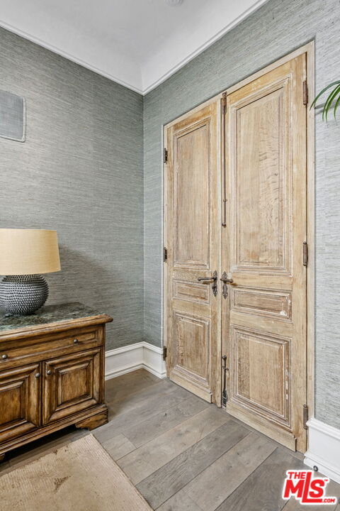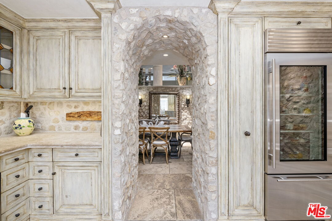 A truly exceptional European-inspired residence offering approximately 2,020 sq ft, this custom 2-bedroom, 2.5-bath townhome with loft presents a rare opportunity within an intimate 7-unit boutique building. Designed and remodeled by a local developer as his personal residence, the home reflects elevated craftsmanship, timeless character, and thoughtfully curated luxury throughout. Soaring ceilings and abundant natural light highlight reclaimed French oak parquet floors and hand-applied Venetian plaster walls, creating a warm and refined ambiance. The elegant living room is anchored by a striking French limestone fireplace and flows seamlessly into a formal dining area featuring a built-in, full-height 146-bottle Sub-Zero wine refrigerator, ideal for effortless entertaining. Beyond a graceful arched stone entry, the chef's kitchen is impeccably outfitted with a 43-inch La Cornue range from France, Miele and Sub-Zero appliances, custom cabinetry, limestone floors and countertops, and a charming greenhouse window. The kitchen opens to a private, sun-filled patio, perfectly suited for outdoor entertaining or relaxed al fresco dining. The upper level offers 2 private bedroom suites and a generous loft, ideal as a den, home office, or potential 3rd bedroom, with plumbing access already in place if desired. The primary suite is a serene retreat featuring a custom limestone fireplace, motorized shades, grasscloth wallpaper, a walk-in closet, and a spa-like bath with steam shower appointed with Blue Savoie marble, antique white and black marble floors, and bespoke European fixtures. Additional amenities include a rooftop deck, Lutron whole-home lighting system, house-wide architectural speaker system, AMX smart home system, premium custom hardware and finishes throughout, a downstairs bonus room ideal for storage or a gym, and 2 secure parking spaces in a gated garage. Ideally located near Santa Monica's shops and dining and just minutes from the beach, this residence offers a rare blend of European elegance and modern coastal California living.