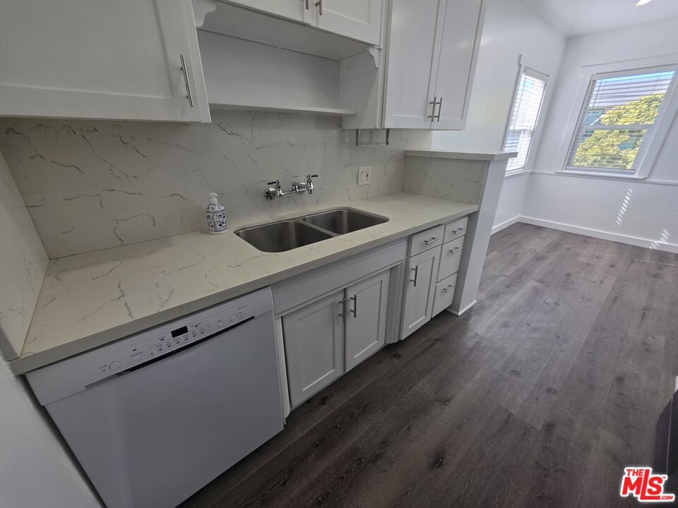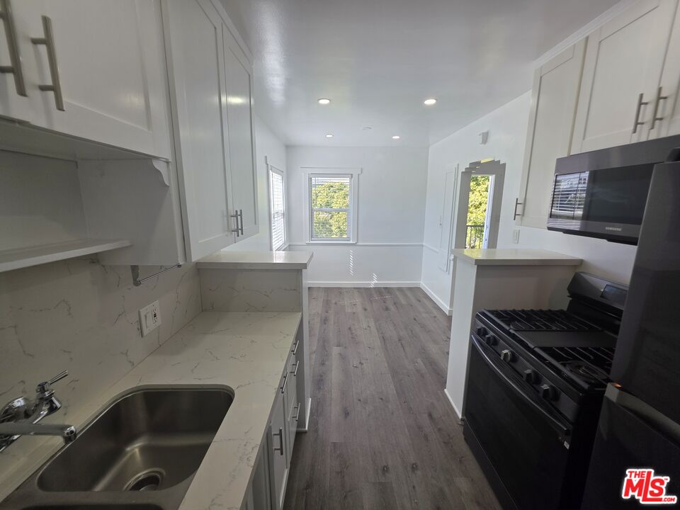 Experience the best of Santa Monica living in this beautifully remodeled top floor one bedroom one bathroom apartment located just minutes from the Santa Monica Pier, Venice Beach, the 10 Freeway, and countless local attractions. Inside, enjoy a fresh blend of modern style and classic charm with newly painted walls, newer hardwood style flooring, and plenty of natural light streaming through multiple windows, including a lovely view of a big green tree just outside the living room. Charming arched entryways add character while a wall heater provides cozy comfort. The updated kitchen features white shaker cabinets, sleek quartz countertops, black stainless steel appliances, and an eat in dining area perfect for daily meals or casual entertaining. The bedroom offers both a ceiling fan and window air conditioner for personalized comfort, and the in unit Bosch stacked washer and dryer provide premium convenience. Parking is available onsite and residents have access to a shared backyard ideal for outdoor relaxation or entertaining. Water is included in the rent while tenants cover electricity, gas, cable, and internet. With only one shared wall and an abundance of natural light throughout, this inviting apartment is available now and offers an exceptional opportunity to live in one of Santa Monica's most desirable neighborhoods. Schedule your private tour today.