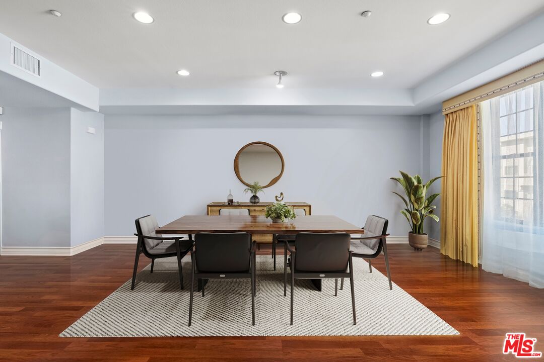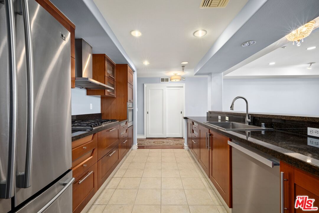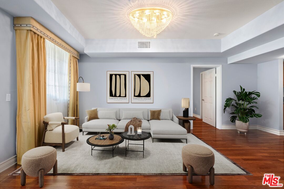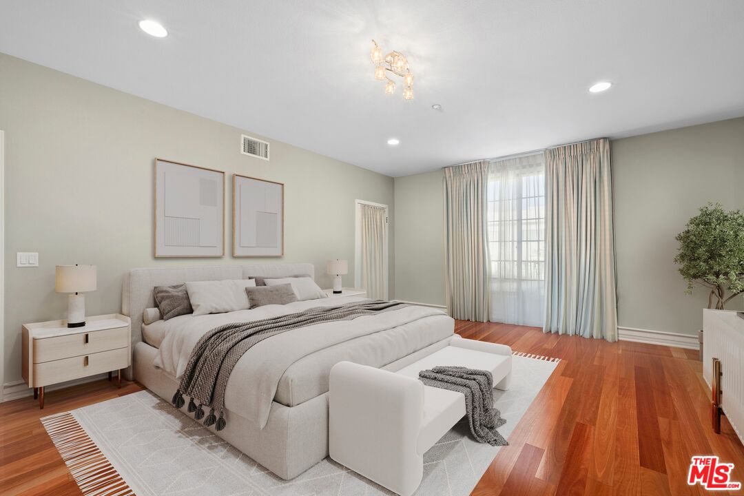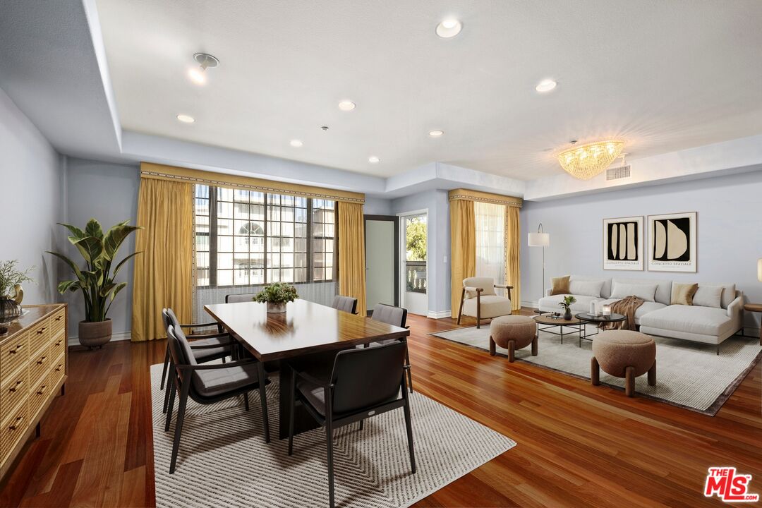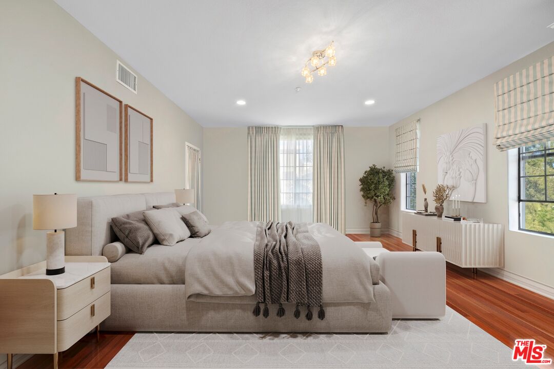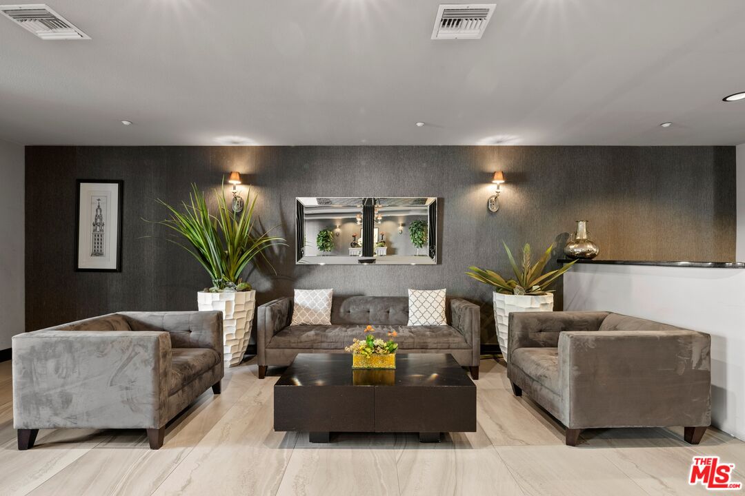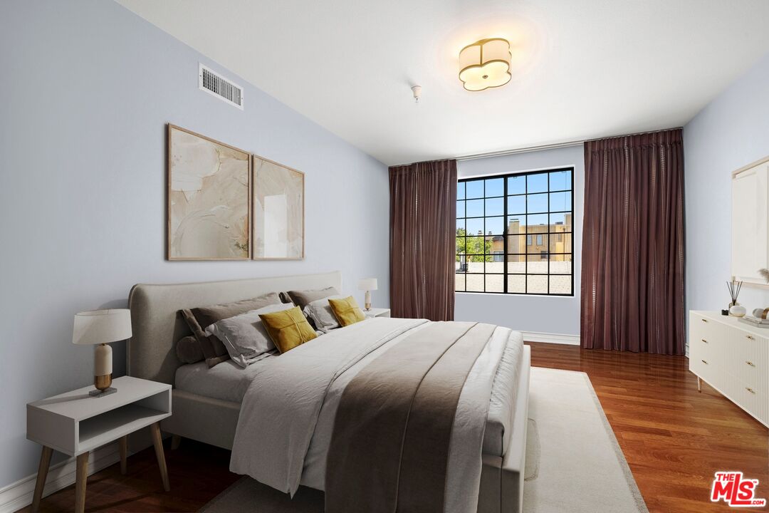 An opportunity to own in a luxury building adjacent to Beverly Hills. This 2-bedroom, 2.5-bath corner unit is private, bright and spacious with an open floor plan, hardwood flooring throughout, chef's kitchen equipped with top-of-the-line Miele appliances and a bar top that seats four. Both bedrooms are en-suite with walk-in closets. Enjoy the comfort and convenience of an in-unit washer and dryer, a private patio, and two assigned parking spaces. This secured building offers amenities including a stylish lobby, controlled access, a recreation room, BBQ area, Sauna and low HOA dues. Located just blocks from the finest shopping, dining, Hospital and entertainment that Los Angeles has to offer. This home combines upscale living with unbeatable convenience. Some photos have been virtually staged.
