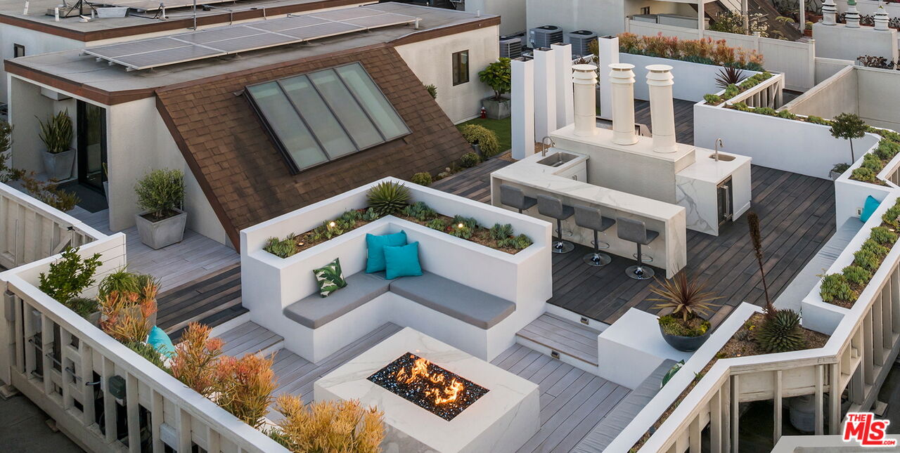 This expansive and luxurious 4 bedroom, 5 bath, 2,475 sq. ft. PENTHOUSE unit with 1,310 sq ft PRIVATE ROOFTOP DECK has been meticulously remodeled with the highest quality finishes. Located in prime, central West Hollywood, close to Melrose Place and numerous high end restaurants and boutique shopping. This unit is the largest floor plan in the building and the private rooftop lounge enjoys sweeping, unobstructed views of the Hollywood Hills and includes a sunken fire pit with abundant seating, outdoor kitchen with barbecue and bar seating, wine fridge, pet area with turf, space for a dining table, built-in planters with drought tolerant plants, uplighting and a drip line. The interior space features Fleetwood double-paned windows and sliding doors plus a vaulted ceiling with large skylight which fills the unit with light throughout the day. High-end Chef's kitchen with eat-in bar, Bosch and Thermador appliances, Heath Ceramics backsplash, Caesarstone countertops and ergonomic cork flooring. The primary bedroom suite has custom walnut closet with concealed laundry leading to gorgeously tiled primary bath featuring Ann Sacks tilework, soaking tub, shower and dual vanity. Additional fixtures include Grohe faucets, George Nelson lighting, 50+ dimmable recessed lighting. Upper bedroom loft features spectacular Hollywood Hills views. The building has wide and updated air conditioned hallways, large hot tub, gym, and 2 side-by-side parking spaces for this unit plus guest parking.