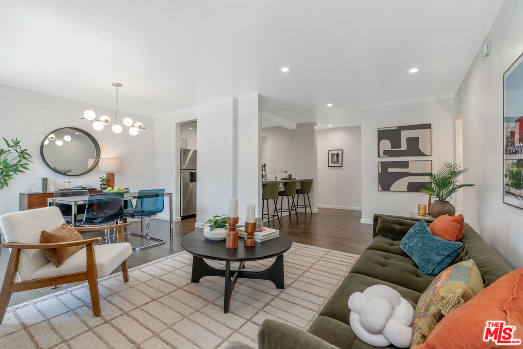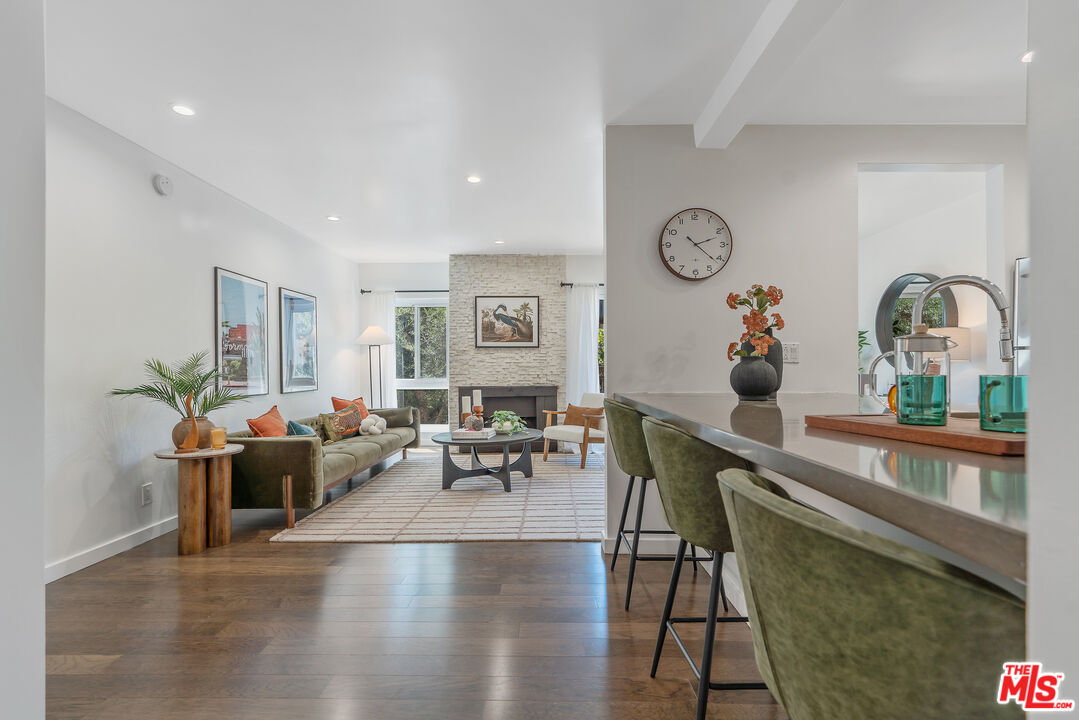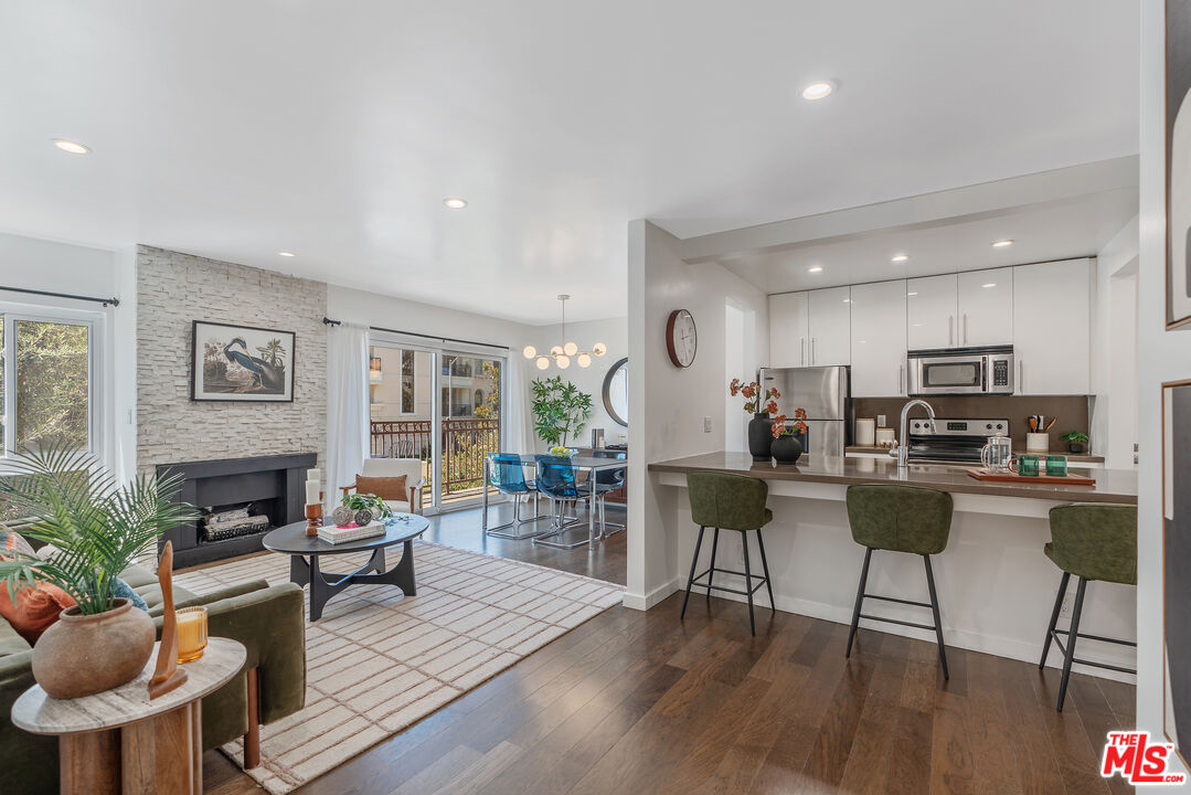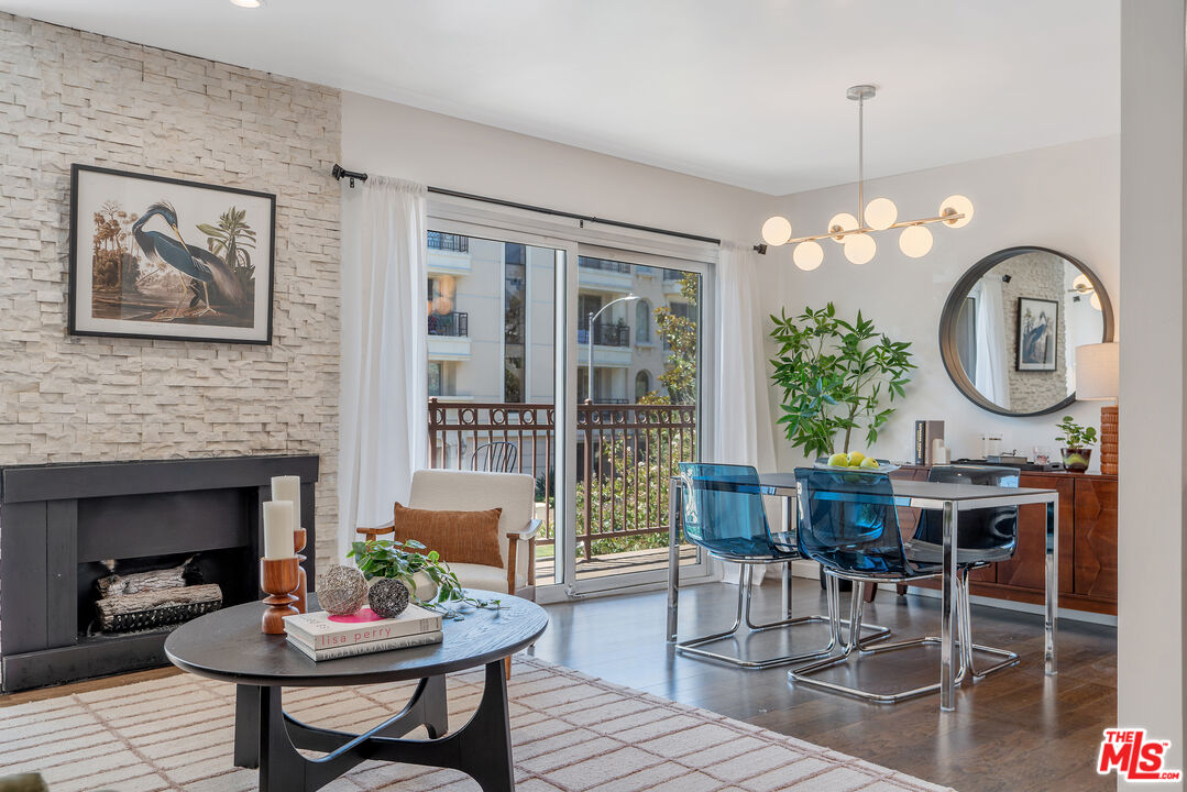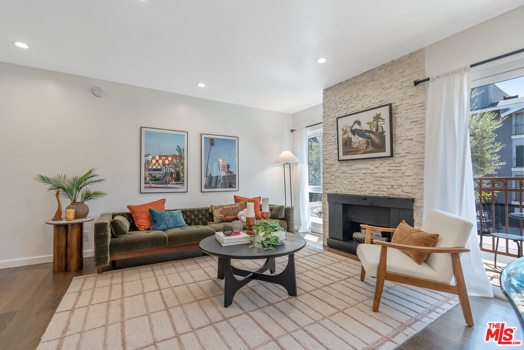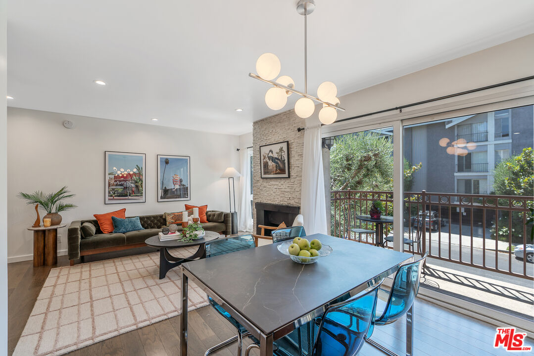 Located where West Hollywood, Beverly Hills, and Beverly Grove converge, this residence at the Rob Clark offers unbeatable access to LA's most coveted destinations. This stylish and spacious end-unit condo is conveniently located near Cedars-Sinai, Beverly Center and the eateries and shops on Robertson Blvd, 3rd St. and Beverly Blvd. This thoughtfully updated home boasts one of the largest one-bedroom floor plans in the building, with rich hickory wood floors, a gas fireplace, and expansive west-facing windows that fill the space with natural light. The open-concept layout flows from the dining area to a sleek kitchen outfitted with Caesarstone countertops, a breakfast bar, and stainless steel appliances, perfect for entertaining or unwinding after a busy day. The generously sized bedroom offers a walk-in closet plus bonus hallway storage, while the oversized private balcony is ideal for enjoying California sunsets. Additional perks include in-unit laundry and central HVAC. Residents enjoy access to a well-maintained building featuring a community pool, fitness center, and BBQ areas. Located in one of LA's most vibrant neighborhoods, you're near hotspots like Catch LA, Gracias Madre, The Henry, The Ivy, and Alfred Coffee, with boutiques, grocery stores, and everyday essentials all nearby. Sophistication, convenience, and comfort converge in this modern urban retreat.