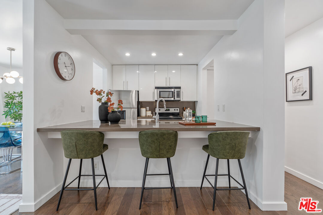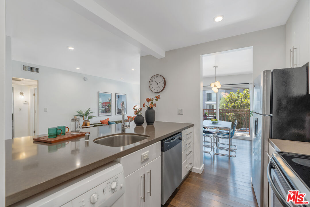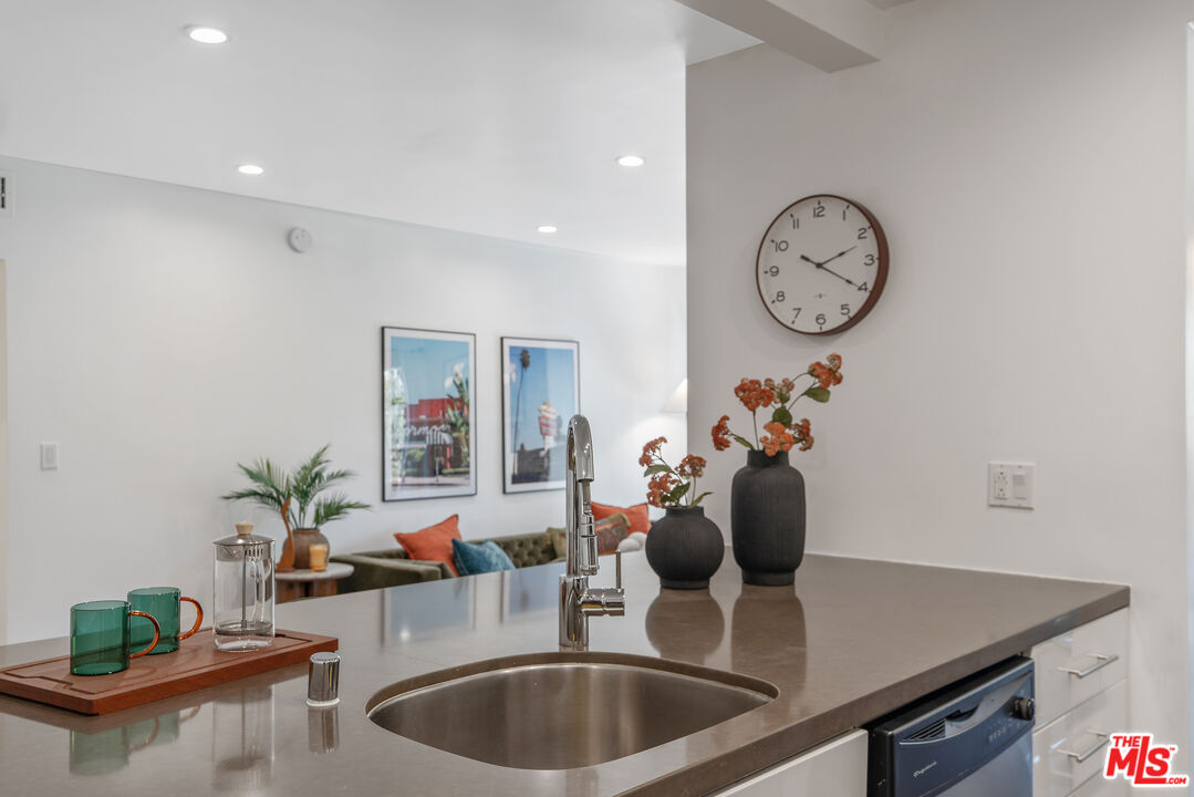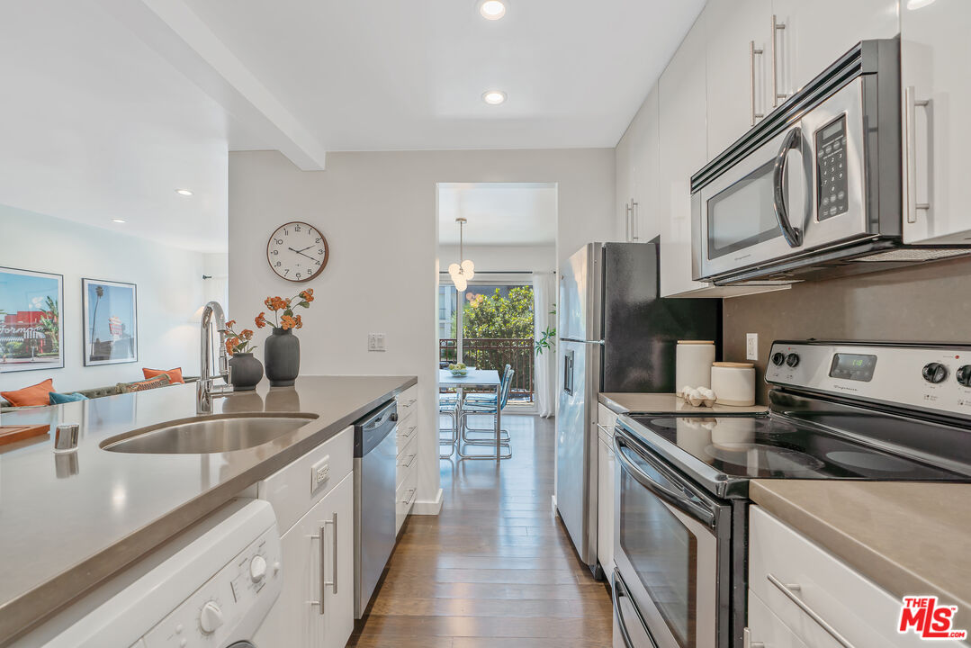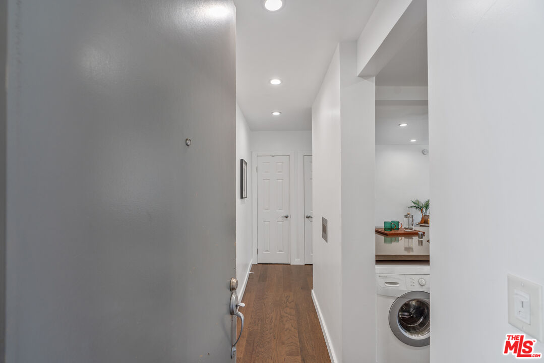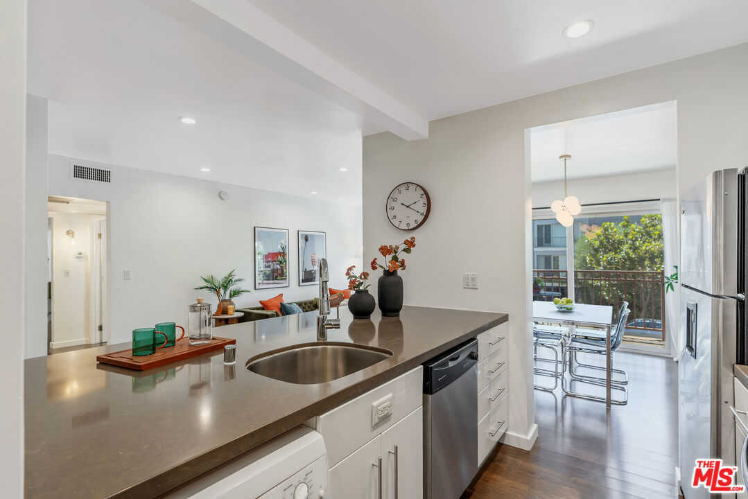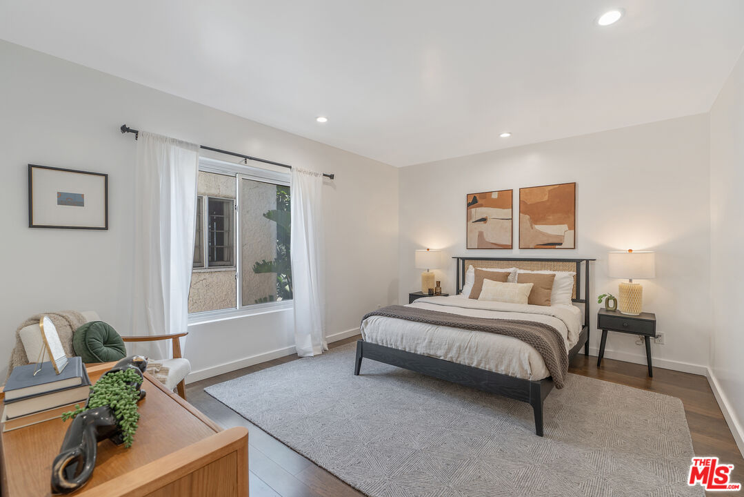 Located where West Hollywood, Beverly Hills, and Beverly Grove converge, this residence at the Rob Clark offers unbeatable access to LA's most coveted destinations. This stylish and spacious end-unit condo is conveniently located near Cedars-Sinai, Beverly Center and the eateries and shops on Robertson Blvd, 3rd St. and Beverly Blvd. This thoughtfully updated home boasts one of the largest one-bedroom floor plans in the building, with rich hickory wood floors, a gas fireplace, and expansive west-facing windows that fill the space with natural light. The open-concept layout flows from the dining area to a sleek kitchen outfitted with Caesarstone countertops, a breakfast bar, and stainless steel appliances, perfect for entertaining or unwinding after a busy day. The generously sized bedroom offers a walk-in closet plus bonus hallway storage, while the oversized private balcony is ideal for enjoying California sunsets. Additional perks include in-unit laundry and central HVAC. Residents enjoy access to a well-maintained building featuring a community pool, fitness center, and BBQ areas. Located in one of LA's most vibrant neighborhoods, you're near hotspots like Catch LA, Gracias Madre, The Henry, The Ivy, and Alfred Coffee, with boutiques, grocery stores, and everyday essentials all nearby. Sophistication, convenience, and comfort converge in this modern urban retreat.