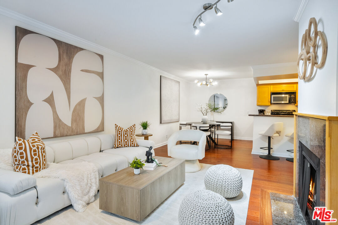 Welcome to the Briarwood, a hidden gem tucked just off the iconic Sunset Strip in the heart of Hollywood Hills West. This spacious 2-bedroom, 2-bath condo spans 1,129 square feet. Step inside to discover an inviting layout with hardwood floors throughout and a living room that seamlessly extends onto a private, generously sized patio. This outdoor oasis stretches along the entire rear of the unit, offering a peaceful retreat with a courtyard ambiance that ensures a sense of seclusion. Freshly painted and updated with some modern light fixtures, this condo home is equipped with central air & heat, and a cozy living room gas fireplace. The large primary bedroom features ample closet space with custom cabinetry and ensuite bathroom with a dual vanity and nicely tiled shower. Meanwhile, the second bedroom is equally inviting, and both rooms have large windows facing the patio adorned with curtains. Another bathroom with shower over tub sits at the end of the hallway for house guests. Unit #104 is conveniently located just off the lobby for easy access, yet enjoys one of the best spots in the building. The Briarwood offers residents a refreshed lobby, a sparkling pool and jacuzzi perfect for soaking up the sun or enjoying an evening under the stars, a sauna, and two assigned tandem parking spaces! A community laundry area, including a washer and dryer just across the hall, makes daily chores a breeze. Nestled on a quiet, tree-lined street dotted with palm trees, this condo is a peaceful haven just moments from Runyon Canyon hiking trails and the 101 Freeway. You'll have the best of Los Angeles at your fingertips - an urban retreat that's still close to everything!