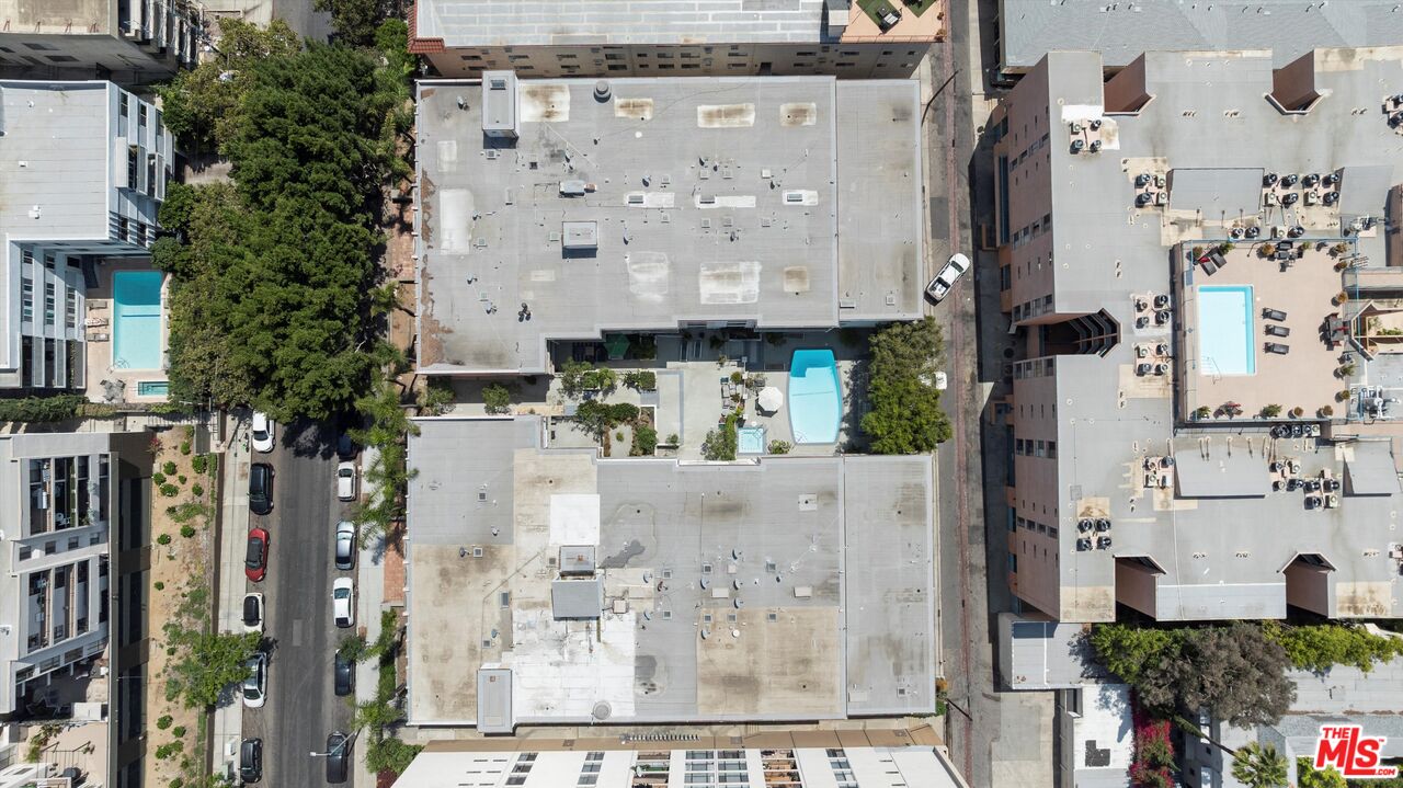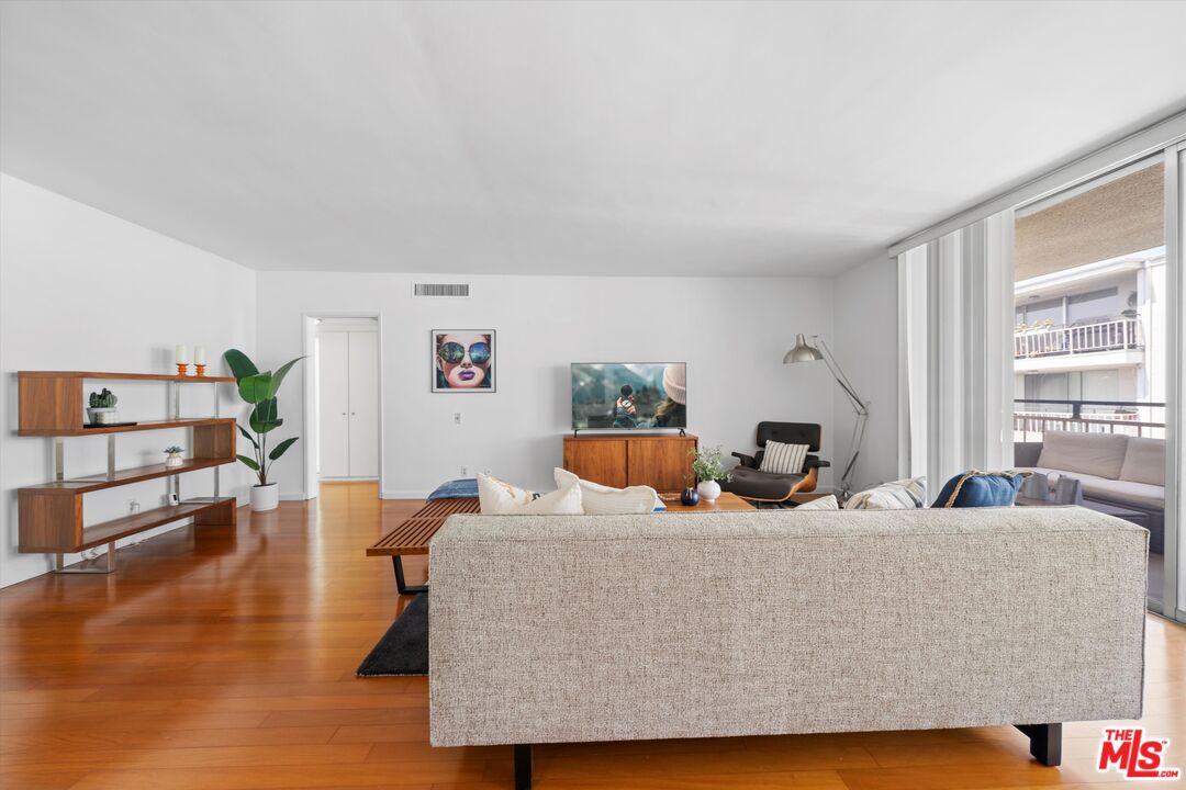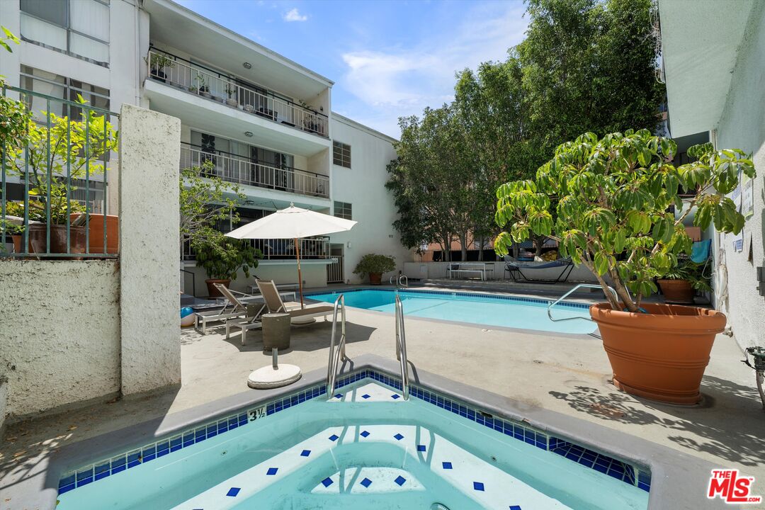 Turnkey, top-floor condo with large private outdoor space in the heart of Hollywood! Freshly painted and filled with natural light, this quiet top-floor condo offers a bright and airy retreat a short distance from the iconic Sunset Strip and Runyon Canyon hiking trails. Enter through double doors into a spacious, thoughtfully designed open layout that gives mid-century vibes and features gleaming hardwood floors, floor-to-ceiling sliders, and an oversized balcony with pool views. The open-concept living and dining areas flow seamlessly into a large, updated kitchen complete with quartz countertops and stainless steel appliances. The bedroom features balcony access, a walk-in closet, and a floor-to-ceiling window that invites in abundant light. With two bathrooms, both with skylights, you can enjoy the flexibility of having separate guest and primary bath options, ready to enjoy or personalize to your taste. Additional highlights include ample in-unit storage, dedicated garage storage, and close proximity to the laundry room, elevator, and parking. The 50-unit Key Largo community offers secured entry, a pool and spa, a peaceful courtyard, and guest parking. Outside, you have easy access to a variety of nightlife, restaurants, fitness options, luxury hotels, and the Hollywood Metro Rail. This vibrant location perfectly blends convenience, nature, and classic L.A. energy.