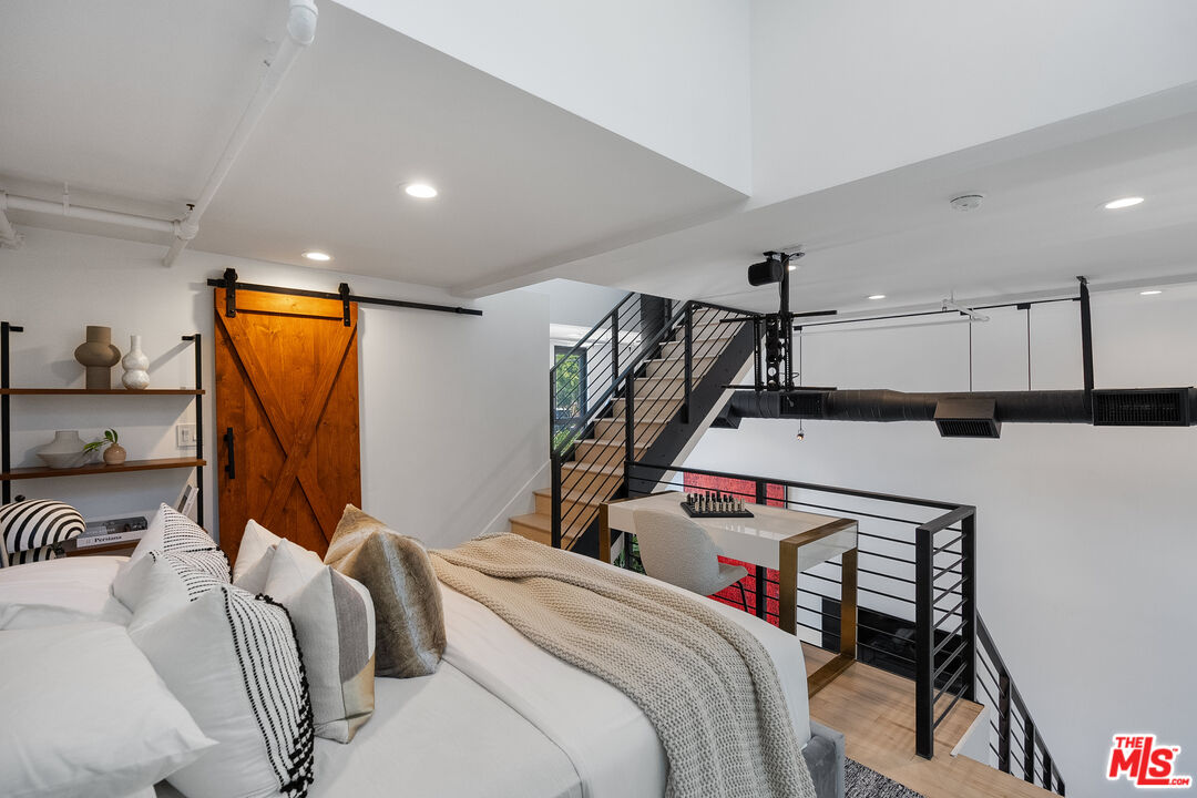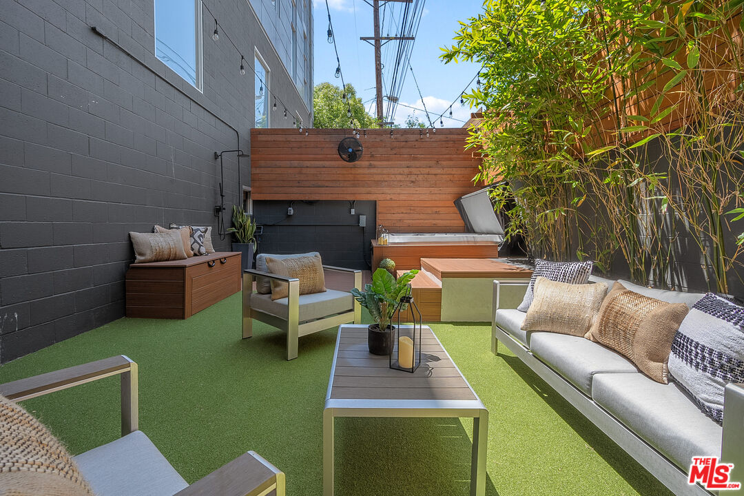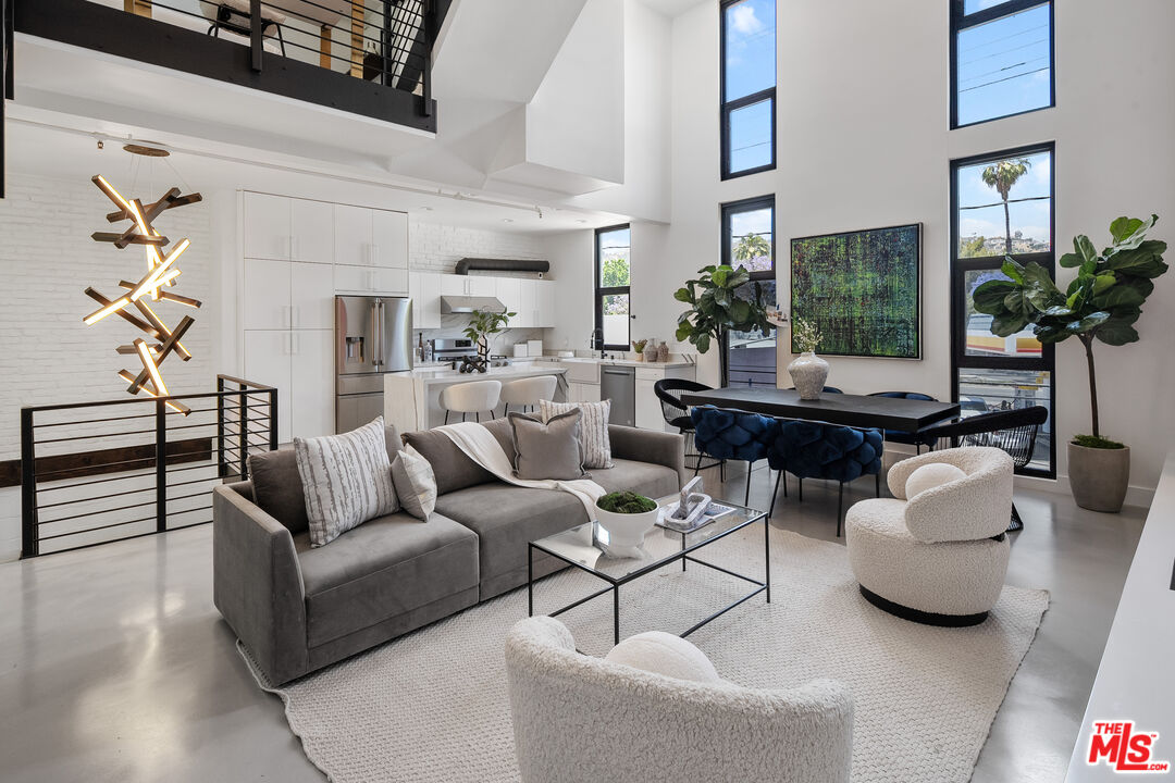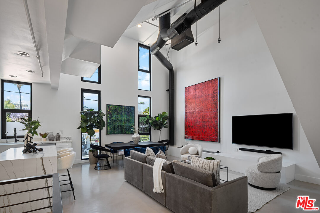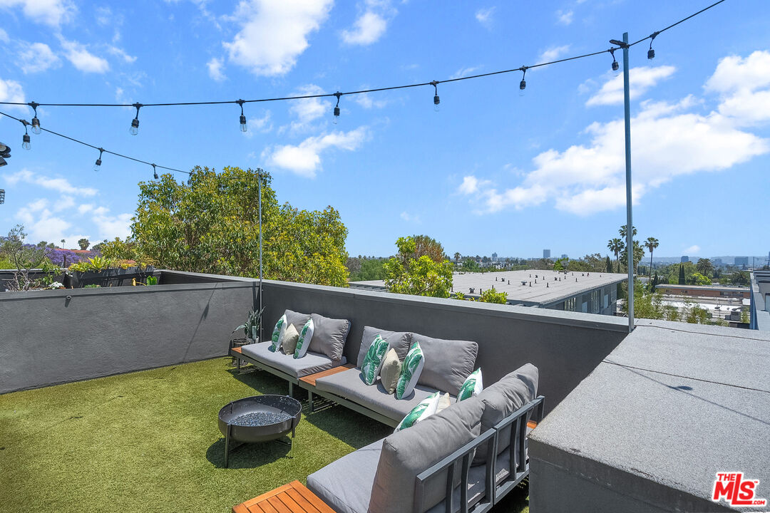 Live above it all in this impeccably designed penthouse condo that lives like a townhouse, nestled in the heart of West Hollywood. Offering over 2,100 sq. ft. of thoughtfully curated living space, this three-bedroom, three-bath residence features soaring ceilings, a striking blend of micro cement and wood floors, and elevated finishes throughout. One of the bedrooms on the first level has been converted into a custom walk-in closet but can easily be transformed back, offering flexible use of space to suit your lifestyle. The bright white kitchen is outfitted with newer appliances and opens into an airy living and dining area that flows effortlessly for entertaining or unwinding in style. Step outside to your private outdoor patio with a hot tub and outdoor shower, or ascend to the expansive rooftop deck to enjoy sweeping views from the Hollywood Hills to downtown Los Angeles. Additional highlights include rare guest parking, extra storage, and an unbeatable location near some of the city's most iconic restaurants, nightlife, and entertainment.