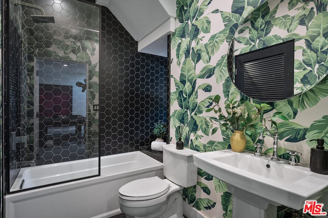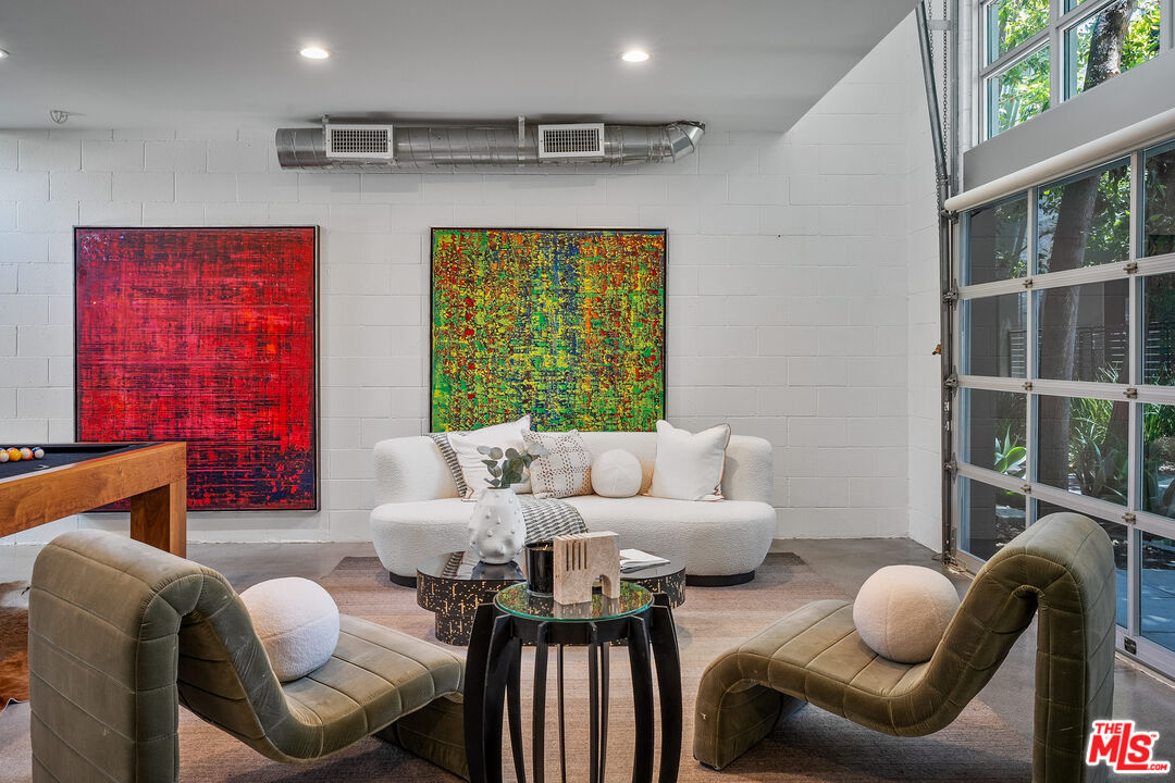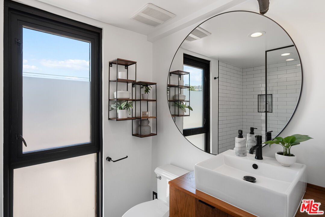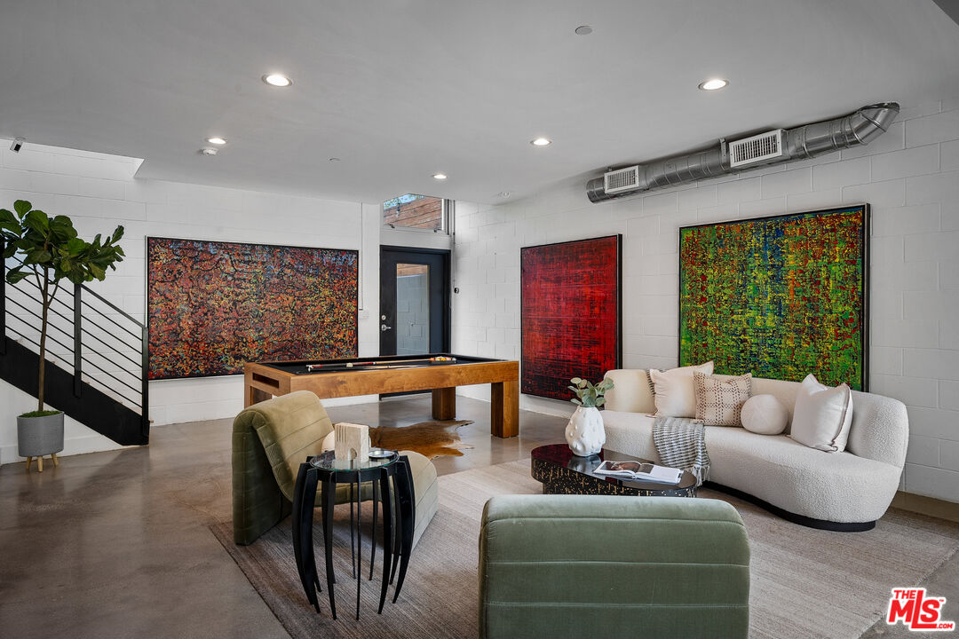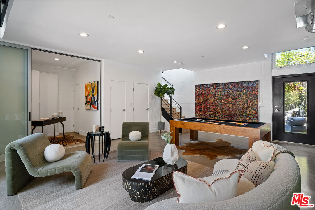 Live above it all in this impeccably designed penthouse condo that lives like a townhouse, nestled in the heart of West Hollywood. Offering over 2,100 sq. ft. of thoughtfully curated living space, this three-bedroom, three-bath residence features soaring ceilings, a striking blend of micro cement and wood floors, and elevated finishes throughout. One of the bedrooms on the first level has been converted into a custom walk-in closet but can easily be transformed back, offering flexible use of space to suit your lifestyle. The bright white kitchen is outfitted with newer appliances and opens into an airy living and dining area that flows effortlessly for entertaining or unwinding in style. Step outside to your private outdoor patio with a hot tub and outdoor shower, or ascend to the expansive rooftop deck to enjoy sweeping views from the Hollywood Hills to downtown Los Angeles. Additional highlights include rare guest parking, extra storage, and an unbeatable location near some of the city's most iconic restaurants, nightlife, and entertainment.