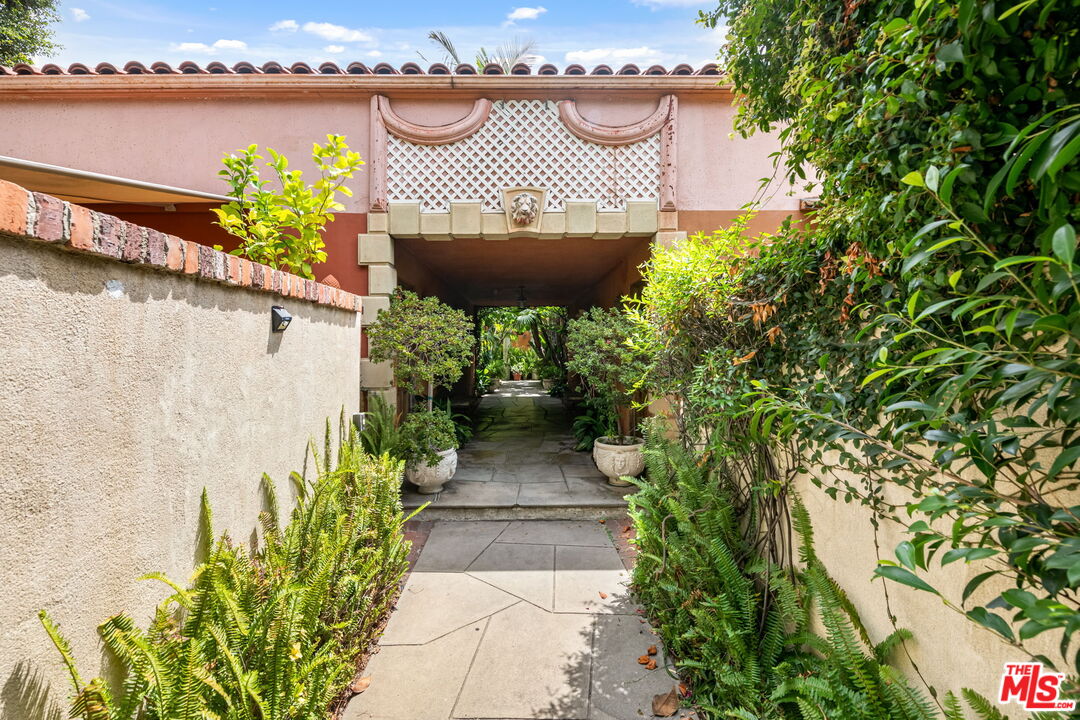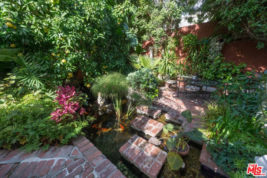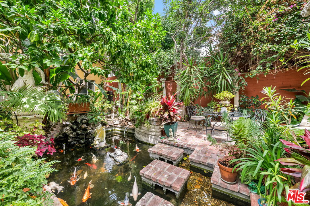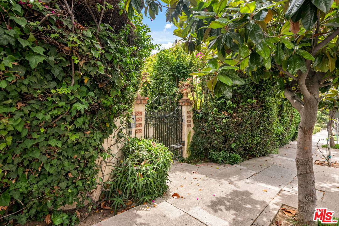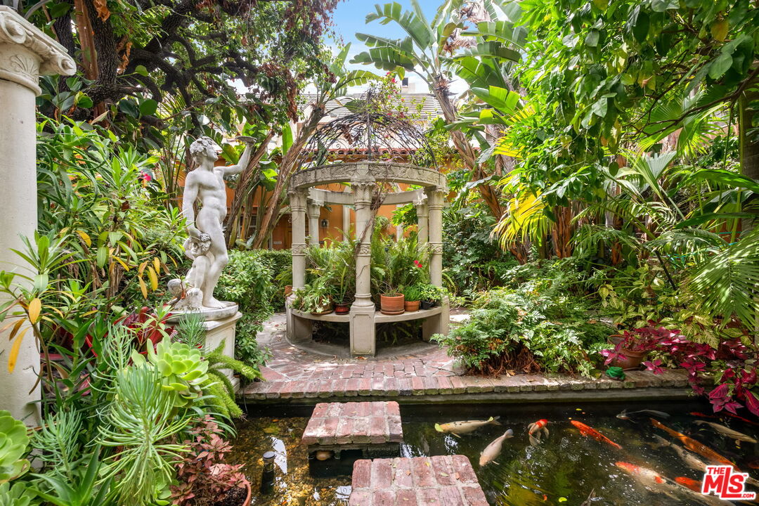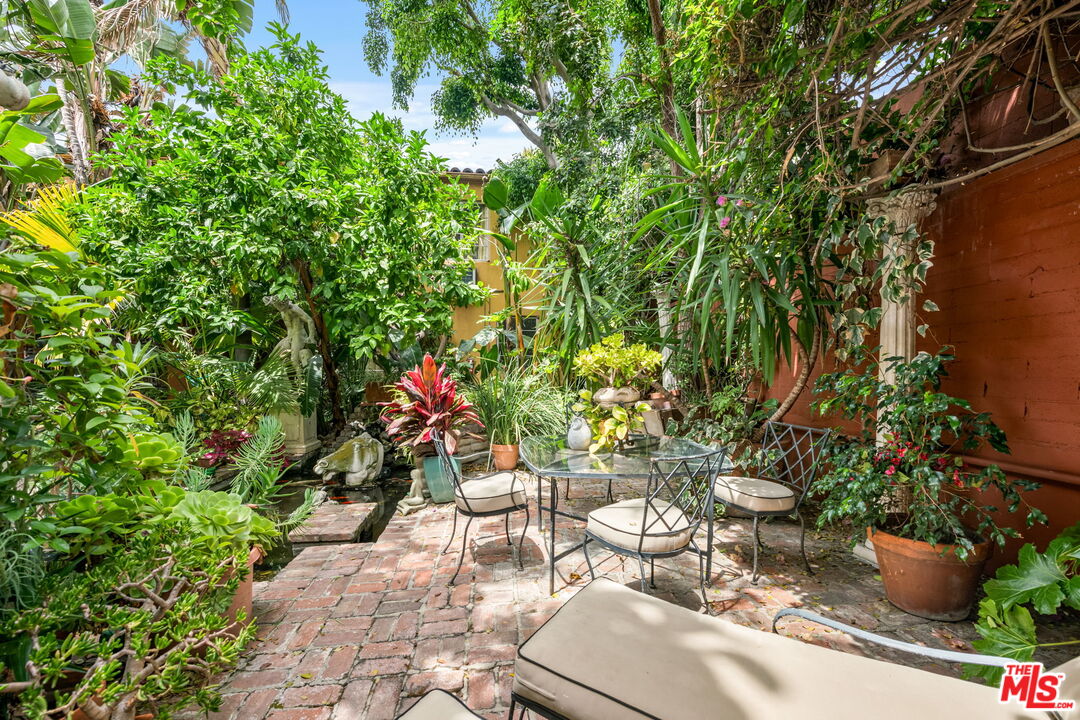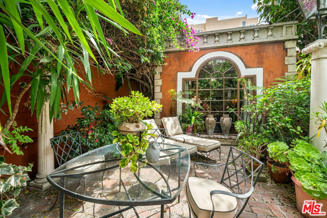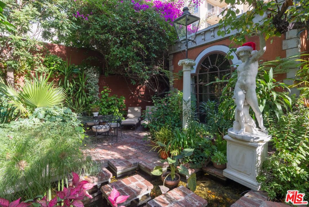 DRAMATIC AND SECLUDED 1930'S COURTYARD TUSCAN VILLA BEHIND GATES. THIS LAVISH OLD HOLLYWOOD 2 LEVEL VILLA, IS BEAUTIFULLY AND COMPLETELY FURNISHED ALL IN HIGHEST QUALITY WITH VINTAGE RUGS, SILK DRAPERIES, ANTIQUES, ORIGINAL ART, FINE LINENS. TALL ARCHED WINDOWS OFF GRACIOUS LIBRARY/ENTRY. GORGEOUS LIVING ROOM WITH 19 FOOT CEILINGS HAS A DECORATIVE FIREPLACE. FORMAL DINING ROOM. KITCHEN COMPLETELY EQUIPPED INCLUDING FINE CHINA, STERLING SILVER & BACCARAT CRYSTAL. GORGEOUS ORIGINAL STAIRCASE LEADS TO A LARGE PRIMARY SUITE WITH AMPLE CLOSETS & STORAGE. HUGE LOFT/MEDIA ROOM THAT CAN CONVERT TO A SECOND BEDROOM WITH PRIVATE BATH & CLOSET. 2-CAR PARKING NEXT TO BACK ENTRANCE. THE LUSH CENTRAL GARDEN, COMPLETE WITH FOUNTAIN, EXOTIC FLORA, TREES, KOI POND AND RESIDENT TURTLES, DEFY THE FACT THAT YOU ARE ONLY A FEW SHORT STEPS FROM SUNSET AND CRESCENT HEIGHTS. IT IS PRIVATE WITH NO COMMON WALLS, QUIET & SECURE.