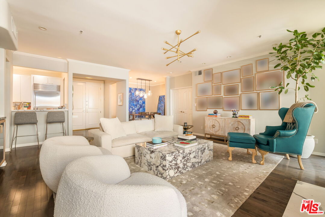 Experience refined living in this elegantly furnished 2-bedroom, 3-bath residence offering 1,464 square feet of meticulously designed space. The open-concept floor plan is graced with high ceilings and elegant hardwood floors that flow seamlessly throughout, creating an atmosphere of timeless sophistication. The custom chef's kitchen features Carrera marble countertops, a breakfast bar, and premium Thermador appliances that flows into the open dining room. The inviting living area centers around a stunning marble fireplace, while twin French doors open to two private terraces, ideal for morning coffee or evening relaxation. The primary suite is a serene retreat with a spa-like bathroom, complete with a built-in vanity, soaking tub, and a spacious walk-in closet. A full in-unit laundry room and generous storage provide added convenience. This full-service luxury building offers a wealth of amenities, including a 24-hour concierge and security, heated pool, fitness center, sauna, meeting room, guest parking, EV charging station and a tranquil courtyard for residents to unwind. Two side-by-side parking spaces in the gated subterranean garage complete this remarkable offering.Perfectly combining elegance, comfort, and modern convenience, this home redefines luxury condo living with walkability to the best restaurants and private clubs West Hollywood and Beverly Hills has to offer. Available beginning of January 2026.