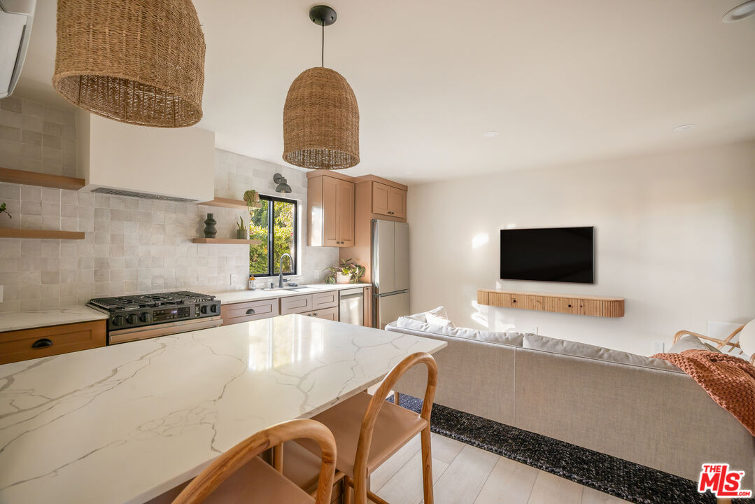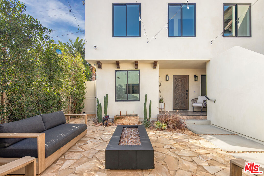Welcome to Villa Galicia, a beautiful new construction, modern Spanish-style villas offering the perfect blend of luxury and privacy. This one-bedroom, one-bathroom gem. Villa Galicia is the first of an exclusive new development of four resort-style villas being offered for lease. Each villa boasts impeccable finishes and thoughtful design details, giving each villa unique and individual charm, yet cohesive flow. Villa 1031 features a spacious, open-concept living area that seamlessly connects the kitchen, dining, and living spaces. The large, well-appointed kitchen is equipped with high-end Samsung appliances including a gas range with air-fry capabilities, a French door refrigerator and a compact dishwasher. The kitchen also offers ample storage, including a pull-out spice rack. The living room offers a large sofa and floating media console, enjoy cinematic entertainment with a Samsung Frame TV and Sonos sound system, perfect for movie nights or unwinding after a long day. The bedroom is generously sized, featuring an attached bathroom complete with a large white oak vanity, sconces, and a luxurious shower with a tiled trench drain for a spa-like experience. For added convenience, the villa is equipped with smart home features, including Schlage electronic deadbolts for keyless entry. An LG washer and dryer tower is strategically located just outside the bedroom. Step outside onto your private covered porch, offering authentic Spanish tile. It's the perfect spot for morning coffee or evening cocktails, offering a serene retreat in the comfort of your own home. The expansive backyard is perfect for outdoor living, featuring West Elm outdoor furniture, a gas fire pit, and a Blackstone grill all for common use. It's an ideal space for entertaining guests or simply relaxing and enjoying the beautiful surroundings. Villa Galicia offers the ultimate resort-style living with modern comforts and unparalleled privacy, making it the perfect home for those seeking both luxury and convenience in one of West Hollywood's most desirable locations, walking distance to many shops, restaurants and new Erewhon opening.