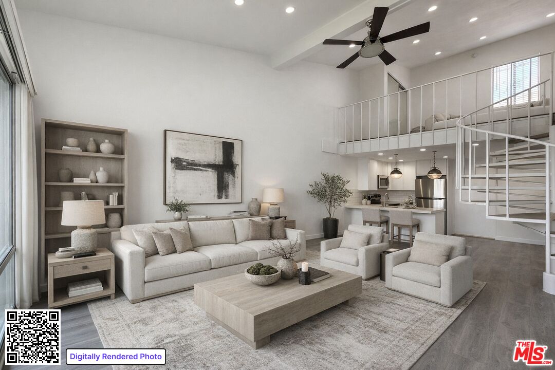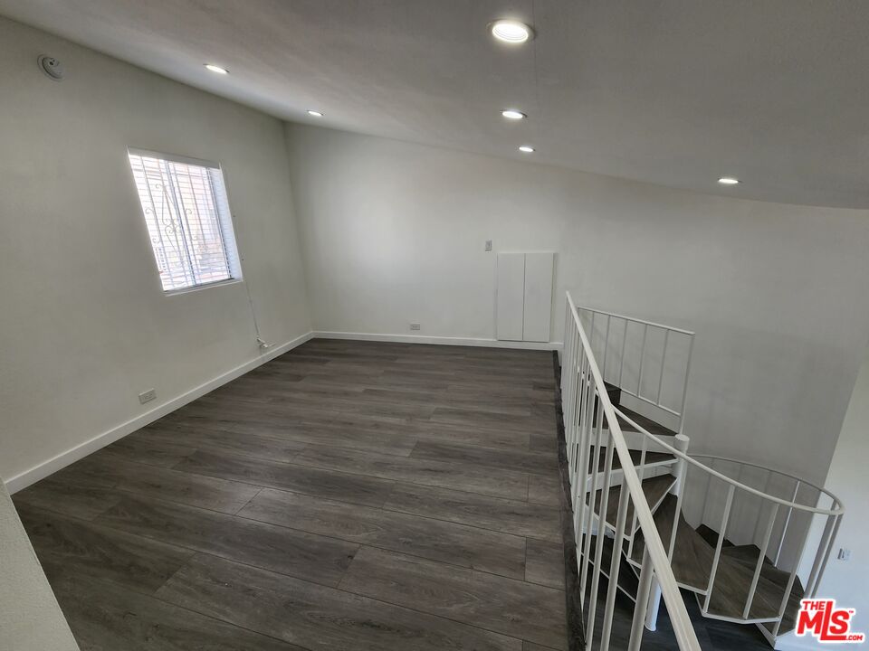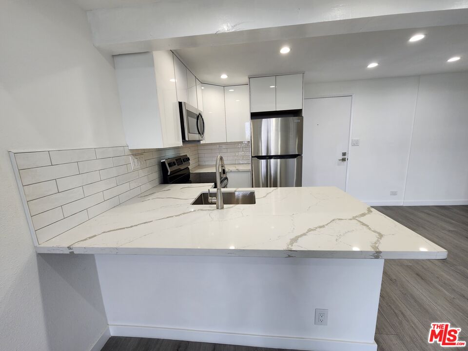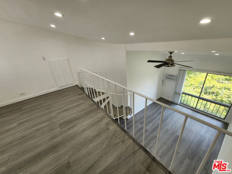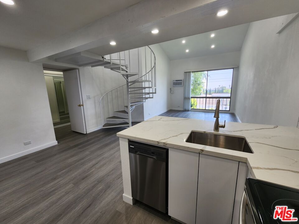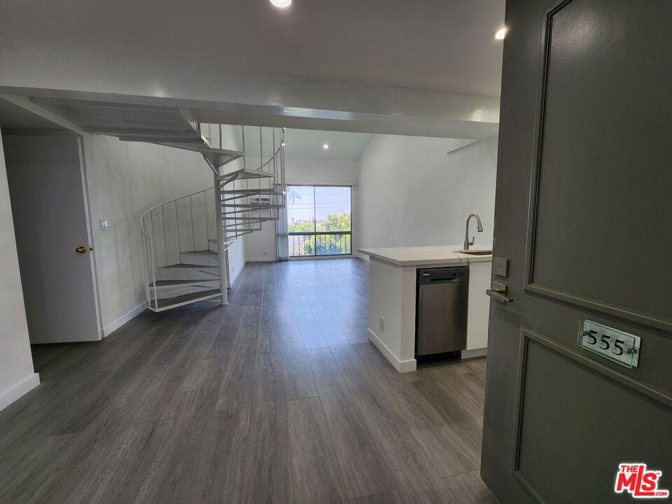Elevate your lifestyle in this fully renovated, modern loft-style condo, perfectly designed for young professionals seeking a chic, boutique hotel-like living experience. Centrally located in the heart of Westwood, this resort-style building offers luxury and convenience, with amenities including a 24-hour security guard, package delivery service, an on-site manager, and a state-of-the-art fitness center featuring a gym, steam room, and sauna. Enjoy the outdoor oasis, complete with lush landscaping, waterfalls, lounging areas, a pool and spa, koi ponds, and even friendly turtles. This top-floor unit boasts expansive tree-top views overlooking the quiet single-family home neighborhood to the south. The sleek kitchen, outfitted with brand-new cabinetry, stone countertops, and stainless steel appliances, seamlessly flows into the open living space, making it ideal for entertaining or unwinding after a long day. A striking spiral staircase leads to the loft area, perfect as a second bedroom or home office/den. The first-floor primary bedroom offers privacy and comfort, with an en-suite bathroom that provides a nice separation of space from the loft area. The condo features new hardwood-style vinyl plank flooring throughout, adding to its modern appeal. With one assigned parking spot in the secured garage and on-site EV charging, your daily commute is a breeze. A large park with tennis and basketball courts, as well as a dog park, is located just across the street. The property is also moments from UCLA, Westwood Village, and the upcoming purple line subway station. Rent includes electricity, water, and trash, and the unit is move-in ready, perfect for professionals seeking a vibrant, convenient Westwood lifestyle. Condo will be available for early February '26 move in.